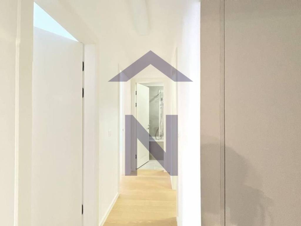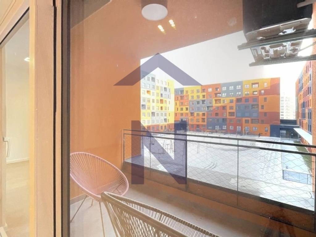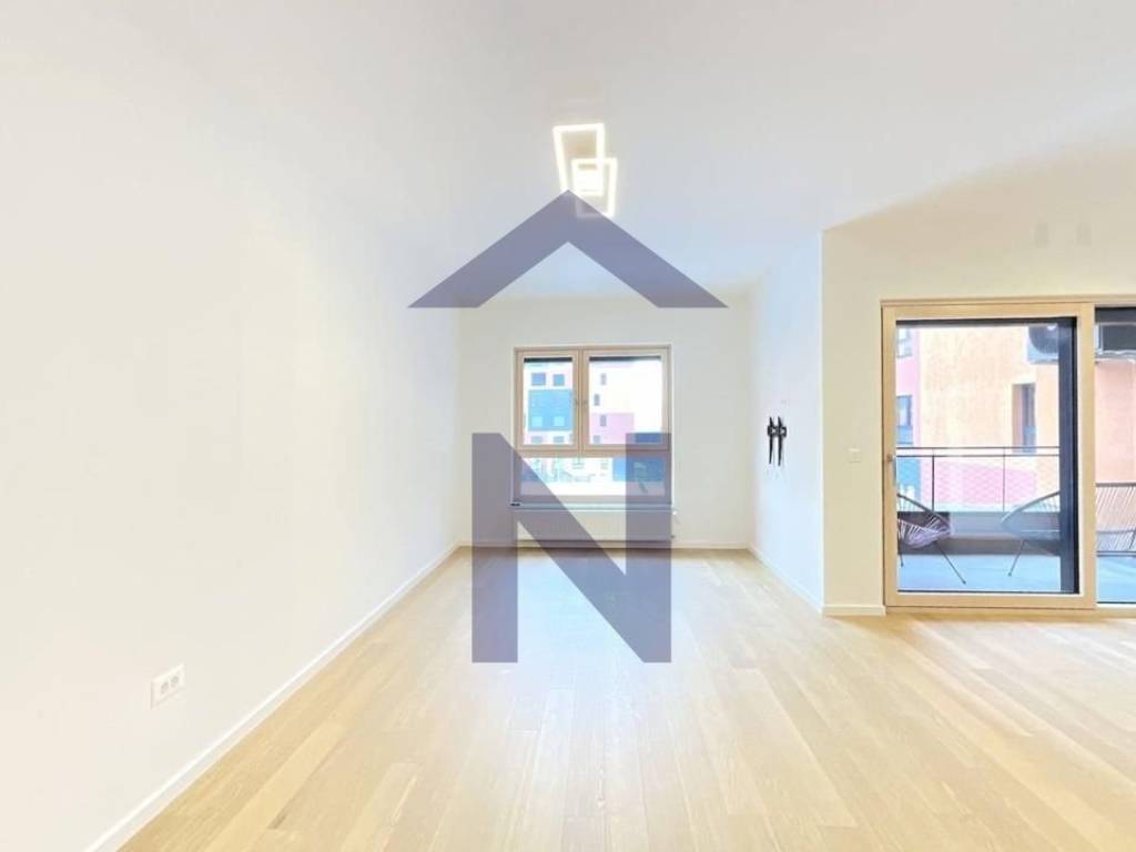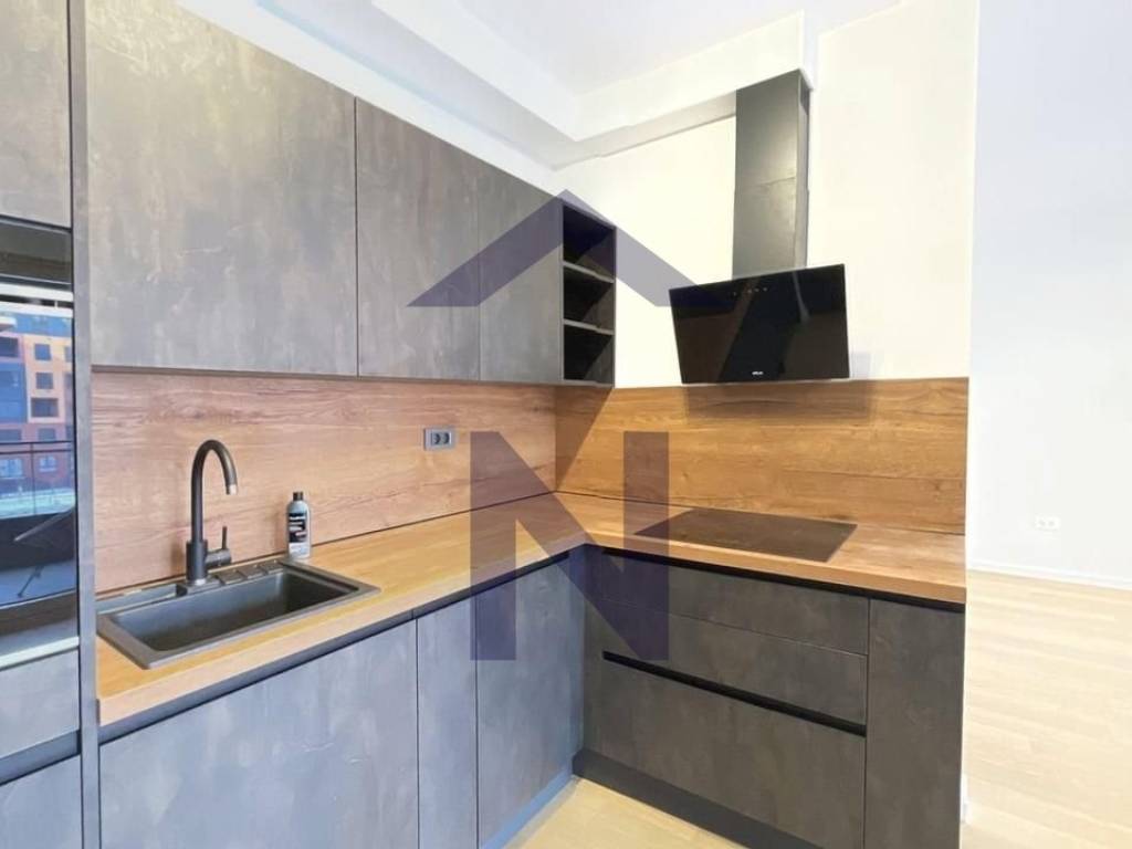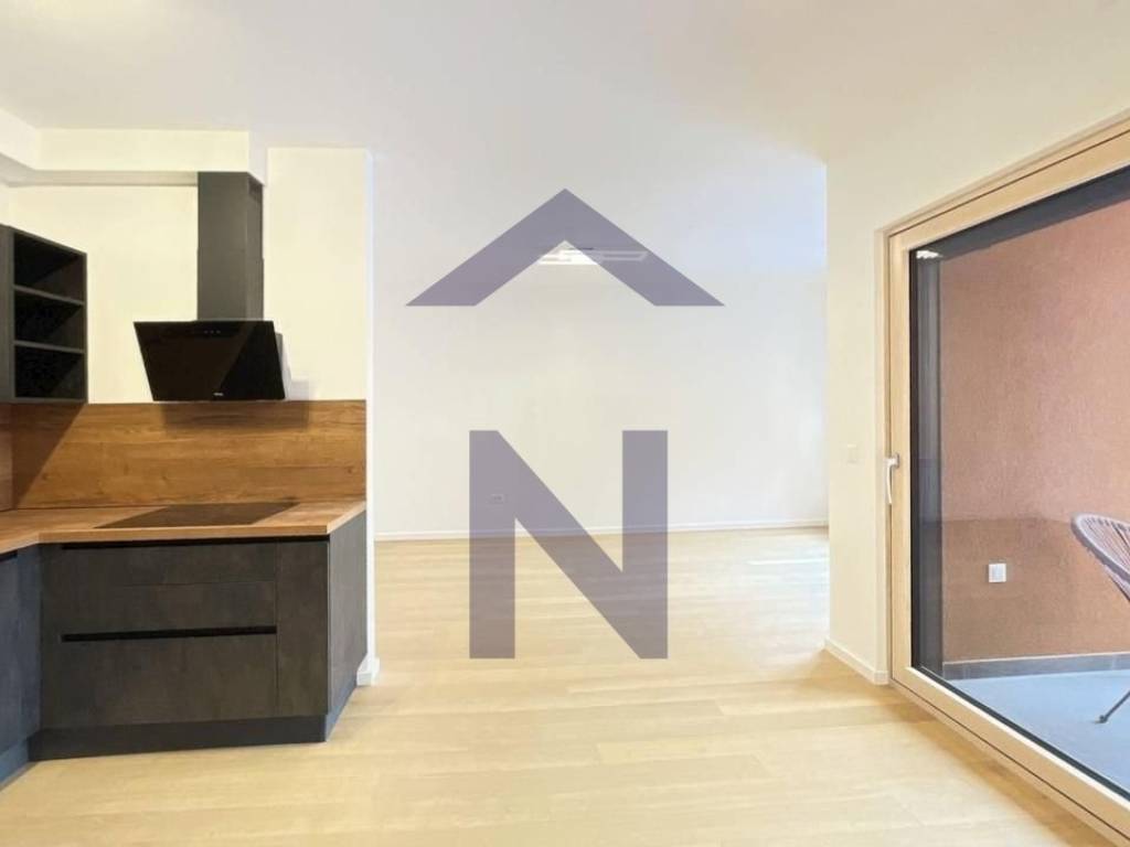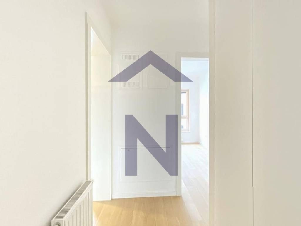 The apartment is partially furnished, featuring a fully equipped kitchen with an oven, induction cooktop, refrigerator, extractor hood, and dishwasher. There is a built-in wardrobe in the hallway, and wardrobes will also be installed in the bedrooms.