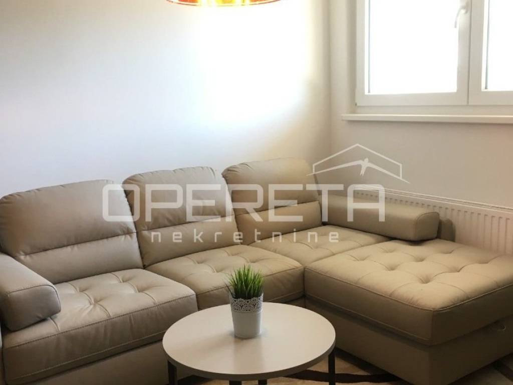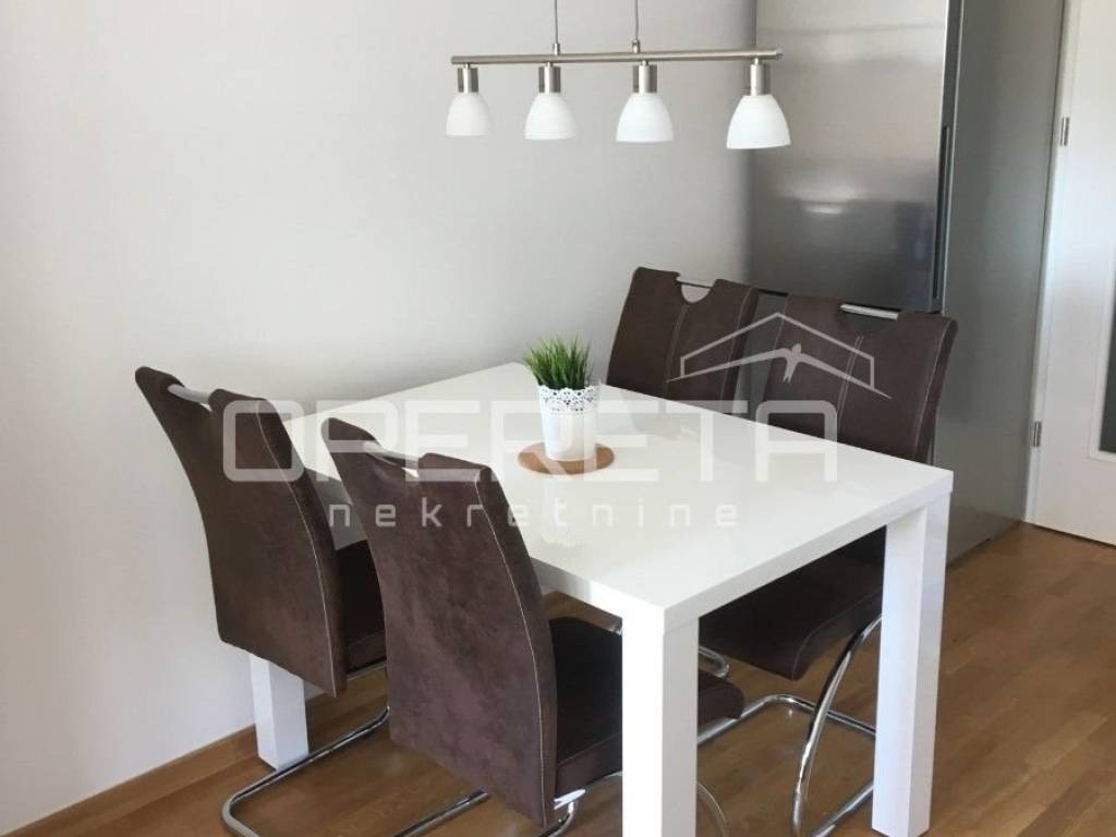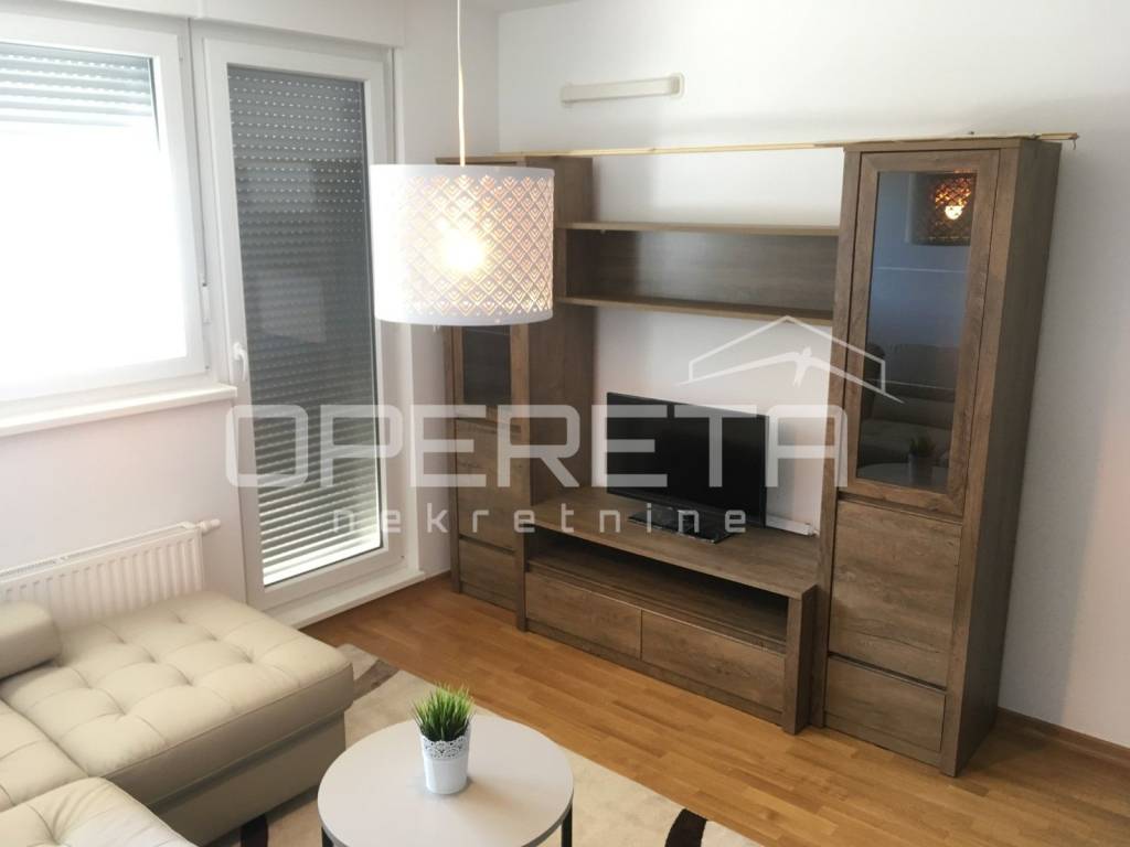 FLAT WITH GARAGE PLACE FOR RENT, TREŠNJEVKA, 47m2 A brand new two bedroom apartment for rent, excellent layout of the rooms, in a good location, with its own garage place included in the rent. The apartment is located in a new residential building (2017 construction), is completely furnished with new, decent furniture and all necessary household appliances. The apartment consists of entrance hallway, bedroom, living room with dining room, kitchen with exit to a loggia of 7m2 and a bathroom.