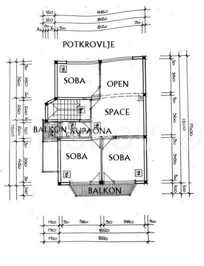 Attic: Two bedrooms, a large open-space area planned for a kitchen and living room, a bathroom, and two balconies.