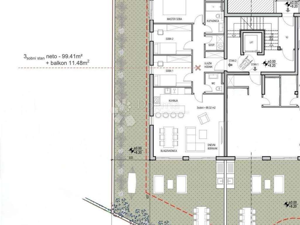 With a total net area of 99.41 m, the apartment features a functional layout including a master bedroom with its own bathroom and wardrobe, two additional bedrooms, a spacious living room connected to the dining area and kitchen, as well as an additional bathroom and WC.