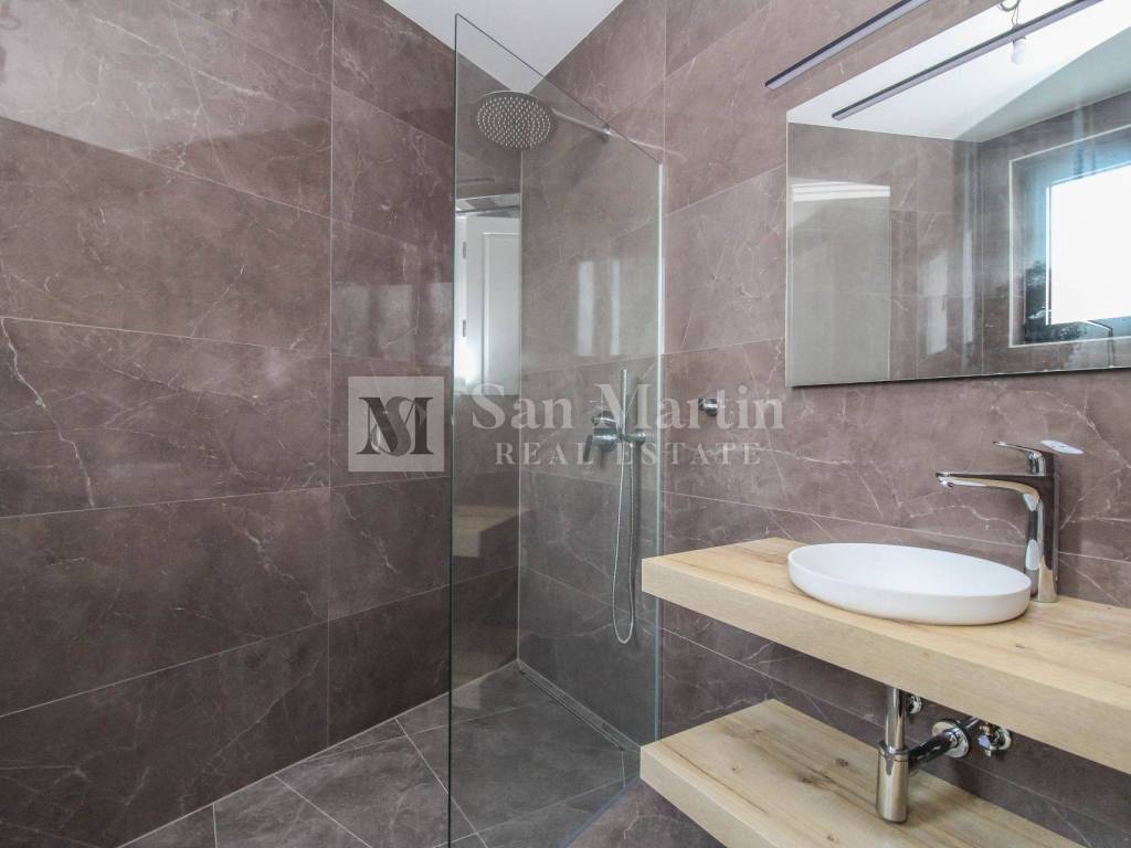 This property with a total area of 82 m2 is for sale on the ground floor of a modern building only 500 meters from the sea. This spacious apartment consists of a living room, a kitchen and a dining room, from which you can go out to your own garden through large glass doors. The apartment also has two bedrooms with equipped bathrooms. This property includes a storage room and a parking space in front of the building.