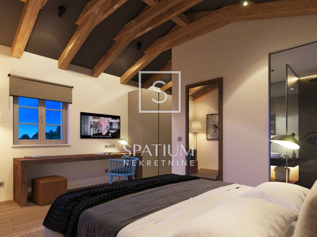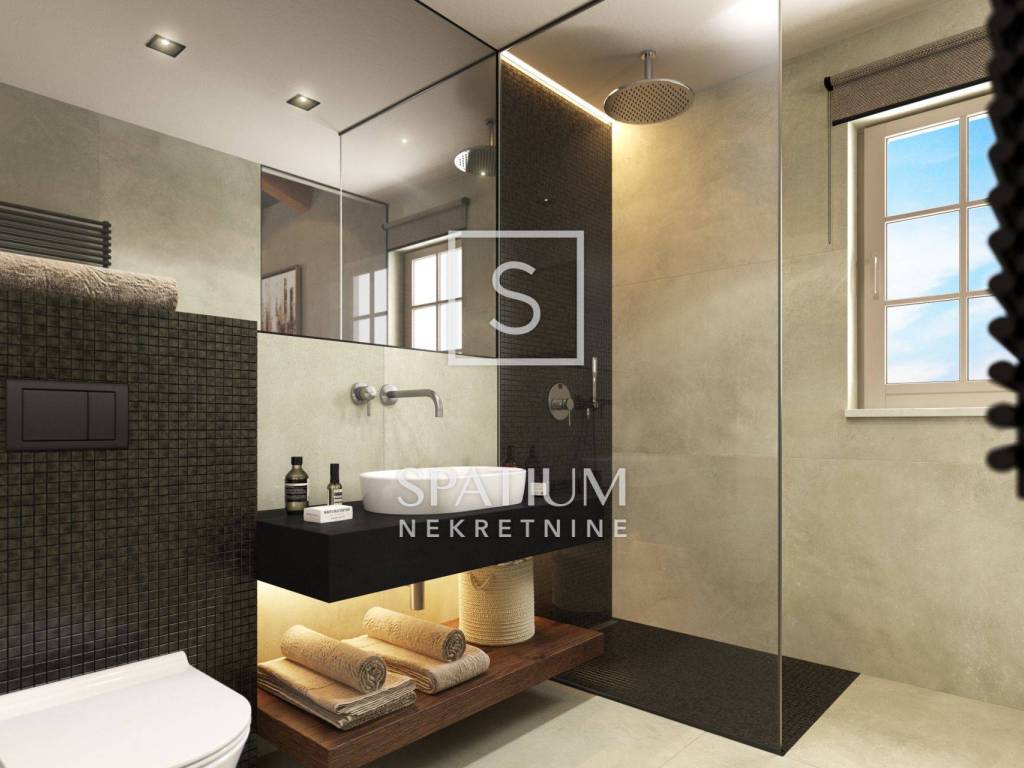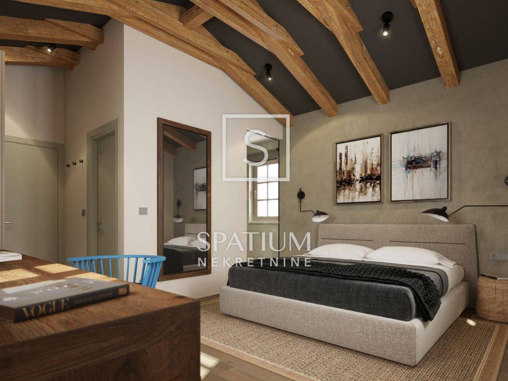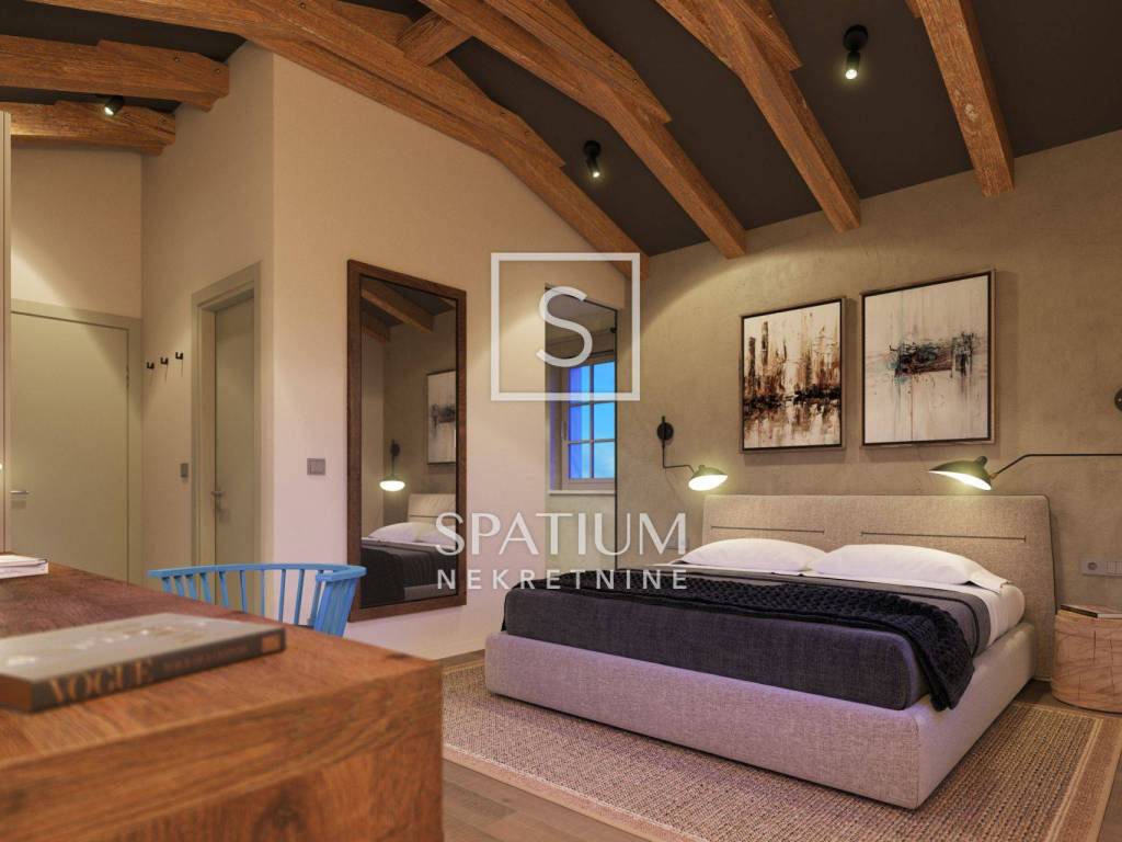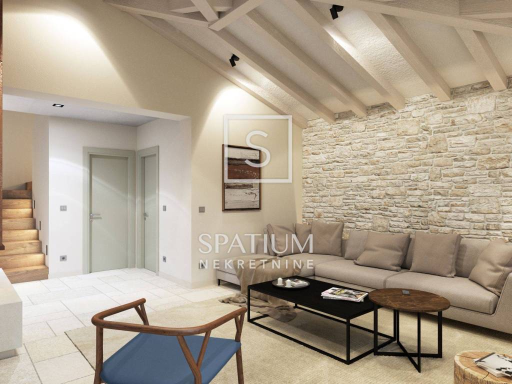 The upper floor (75.20 m²) includes three bedrooms, each with its own en-suite bathroom, designed with special attention to detail — combining high-end materials and authentic Istrian charm.
