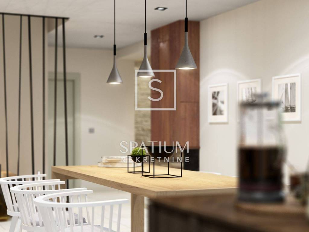 The ground floor (121.05 m²) features a fully equipped modern kitchen with top-quality appliances, a spacious living room, one bedroom, and a bathroom.