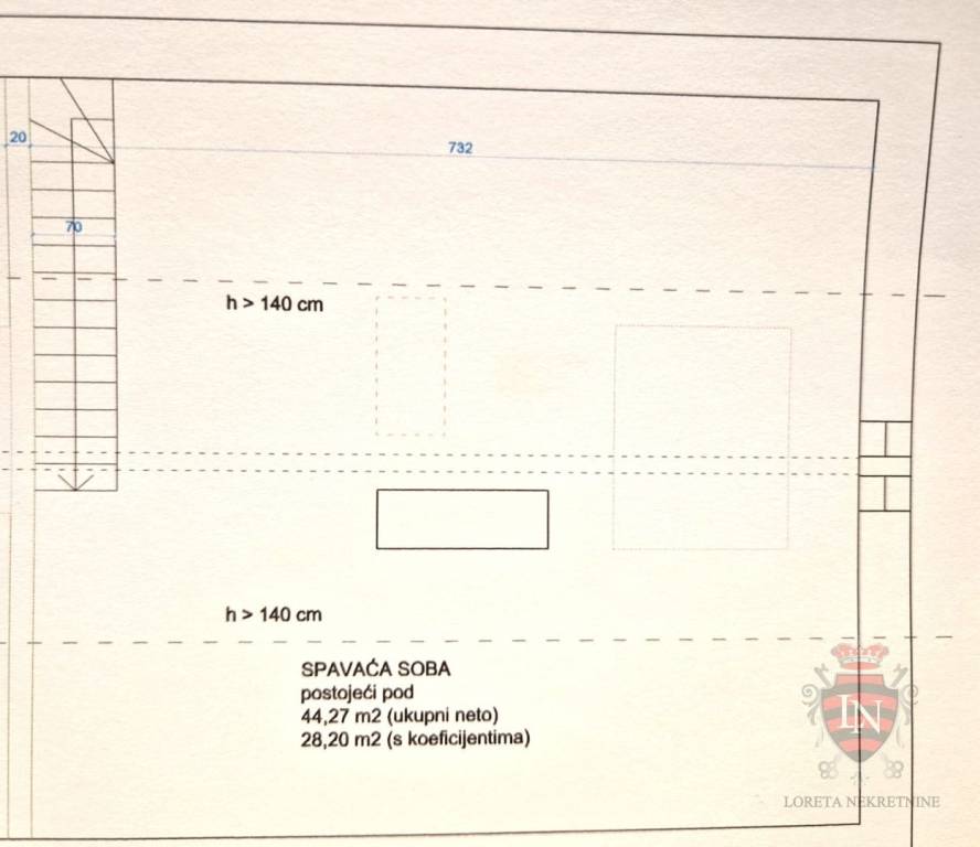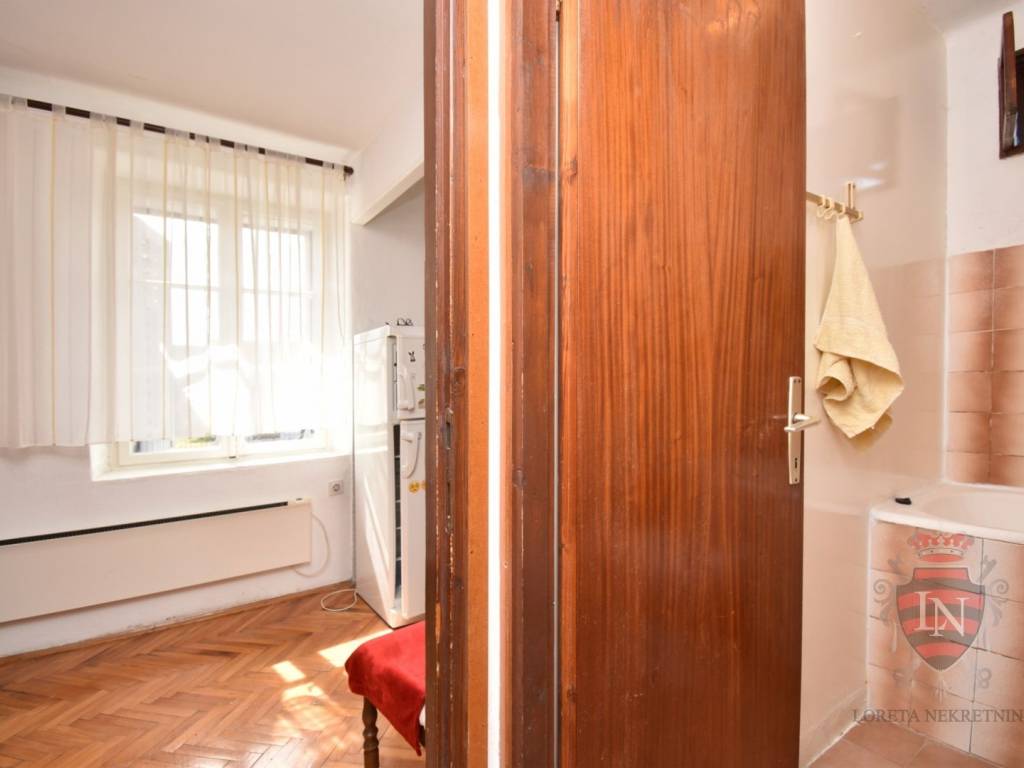 The apartment consists of an entrance hall (area of 6.43 m2), bathroom (area of 5.70 m2), bedroom, kitchen with dining room and living room along the entire south side (area of 25.97 m2) from where there are internal stairs to the attic where there is a spacious bedroom with a net area of 28.20 m2 (actual area of 44.27 m2) and a storage room in the basement with an actual area of approximately 10 m2.