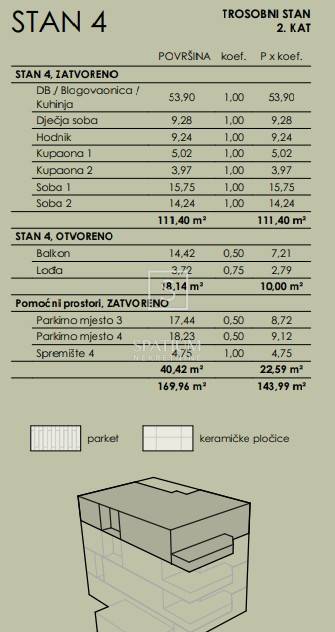 BIVIO, offers an apartment with a garden located on the ground floor of a small new building. The area of 113.82 m2 is well distributed into an entrance hall, two large bedrooms, one of which has a separate wardrobe, a bathroom and a living room with a kitchen and dining area. The living area leads to a terrace with a garden area. The apartment has two garage parking spaces. The building is a reinforced concrete structure and the facade will be covered with an ETICS system with a 10 cm thick thermal insulation. The exterior joinery will be aluminum with built-in electric roller shutters. The floor coverings will be high-quality Italian ceramics and parquet. The proximity of the sea, all amenities, and the position and orientation of the building provide a very pleasant environment and a place for perfect family life. The promenade from Kantrida (Bivija) to Preluk connects a whole series of larger and smaller beaches and bays. Along the way, you will come across numerous facilities - from catering facilities, sports facilities to parks for children located in the deep shade of greenery. You will find the perfect combination of sea and nature in this part of Rijeka. For further information, please contact us with confidence. Spatium nekretnine +385 51 272 903 info@spatium.hr