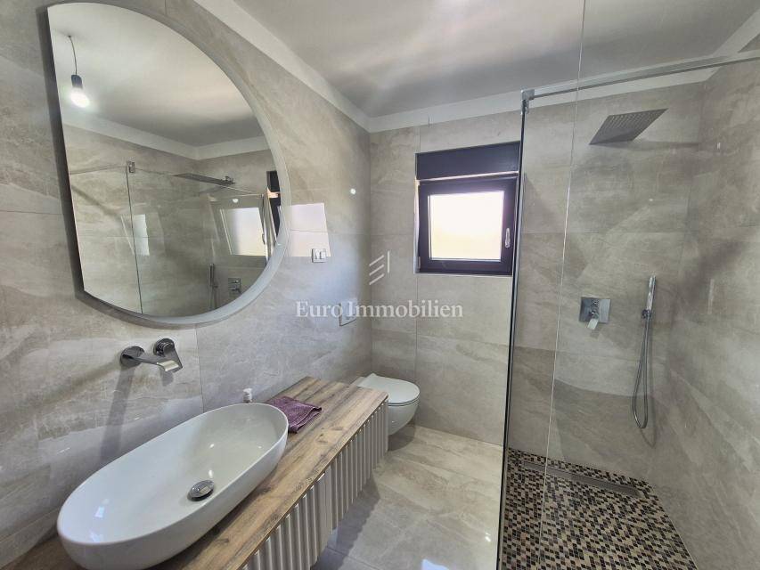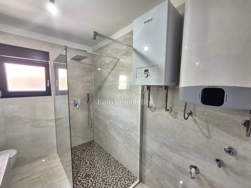 The apartment is located on the first floor of a residential building with a total of three residential units. It consists of a hallway, living room with access to a terrace with a beautiful view, kitchen and dining room, two bedrooms and two bathrooms. The property was built in 2023 and the highest quality equipment was used in the construction. The apartment is fully air-conditioned and has underfloor heating. It comes with one parking space with an electric vehicle charger. It is located in an excellent location in Malinska, approximately 650 meters from the sea.