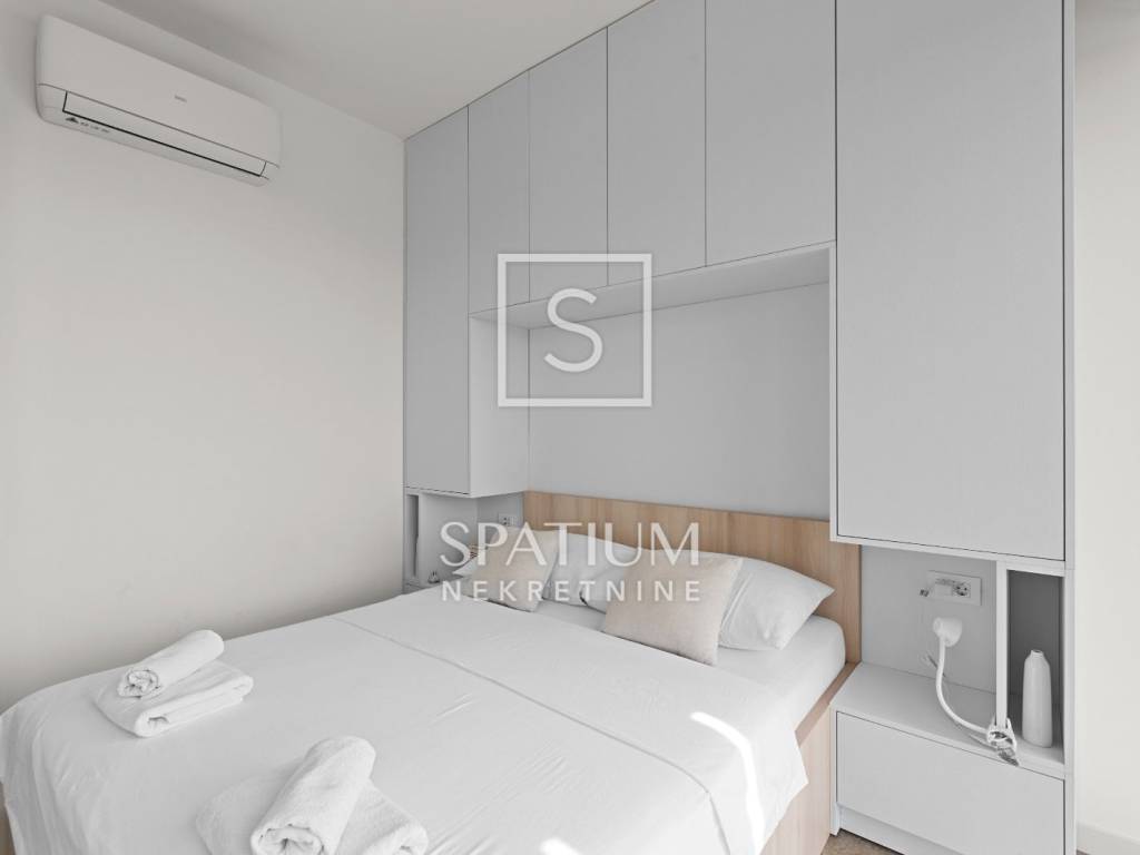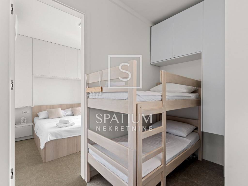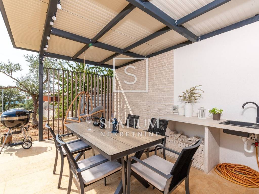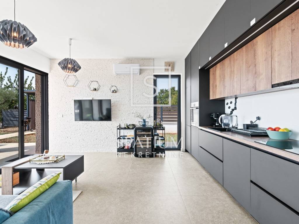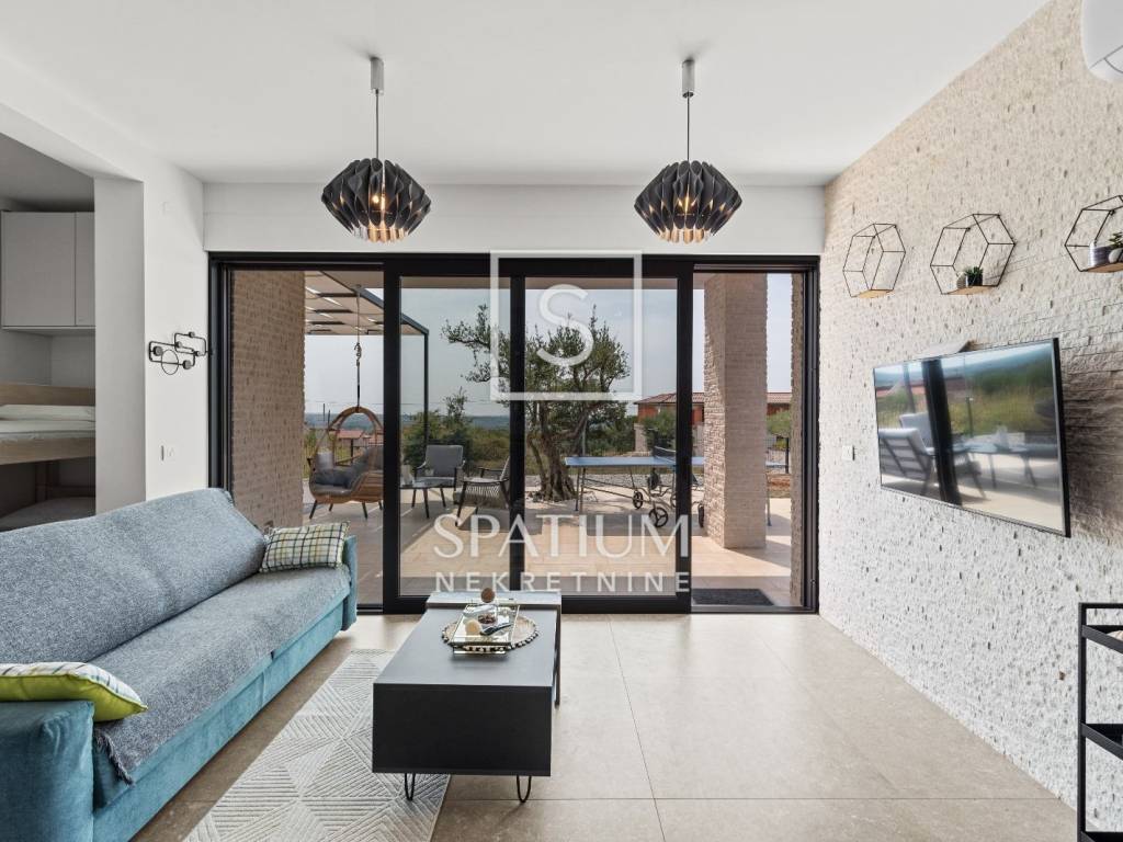 The house comprises one bedroom, a living room with two additional sleeping spaces, a bathroom, and an open-plan kitchen and dining area. It is fully equipped for comfortable living – air conditioning, underfloor heating, aluminum joinery, as well as a private pool, outdoor shower, and two parking spaces.