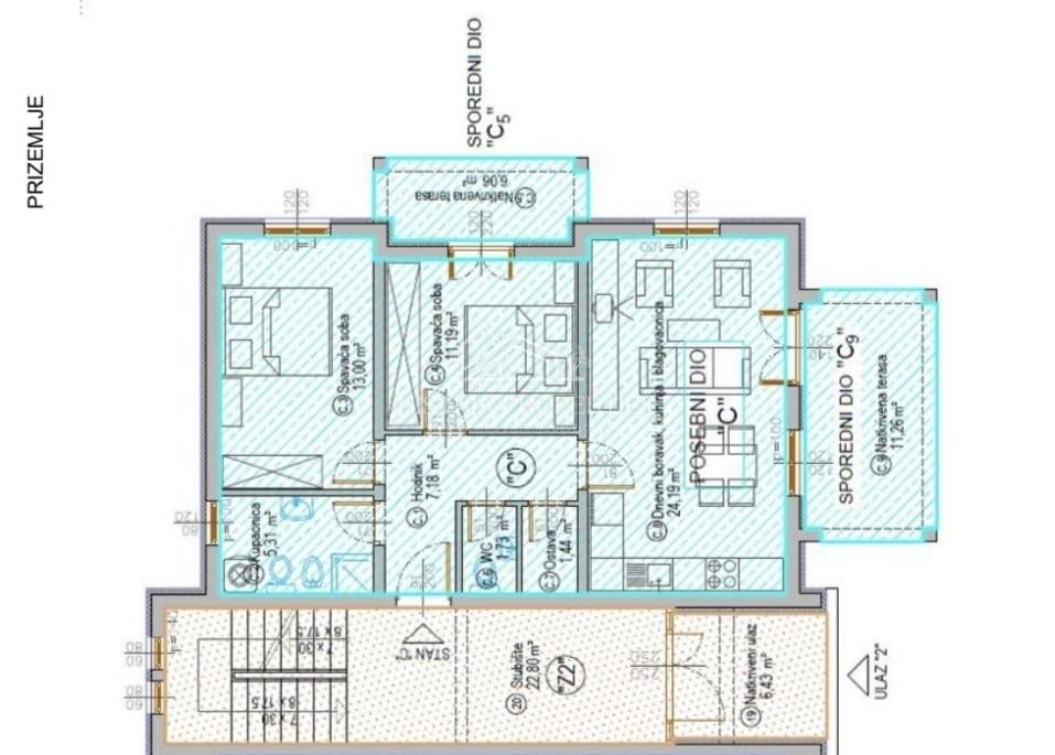 The apartment on the ground floor of the building consists of an entrance hall that connects all the rooms inside the apartment. The open living area with kitchen and dining room leads us to a terrace connected to a large yard and a green belt suitable for setting up a summer kitchen and prefabricated pool.