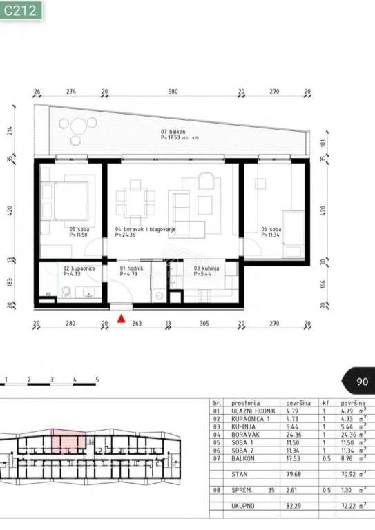 Apartment C212 consists of an entrance hall/wardrobe, bathroom, 2 bedrooms with exits to the terrace, and a living room in an open space concept, which is illuminated by a large glass wall through which you can access the large terrace with a sea view.