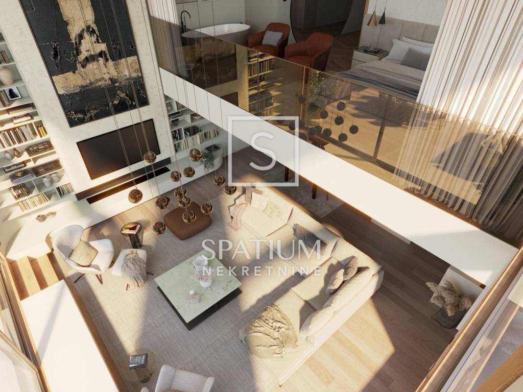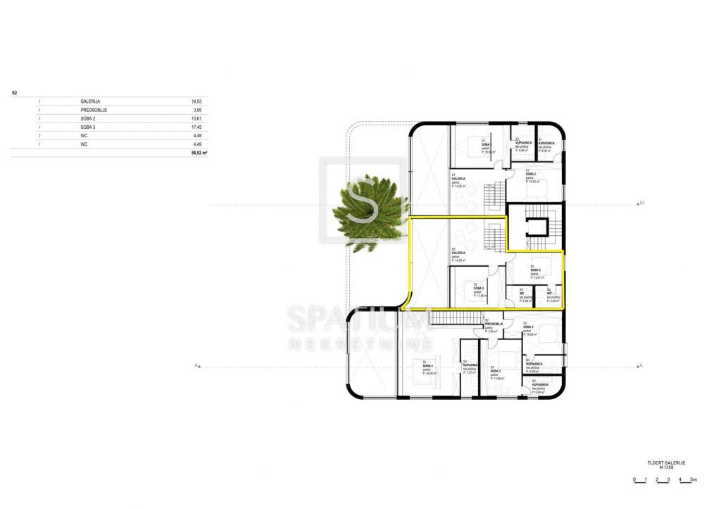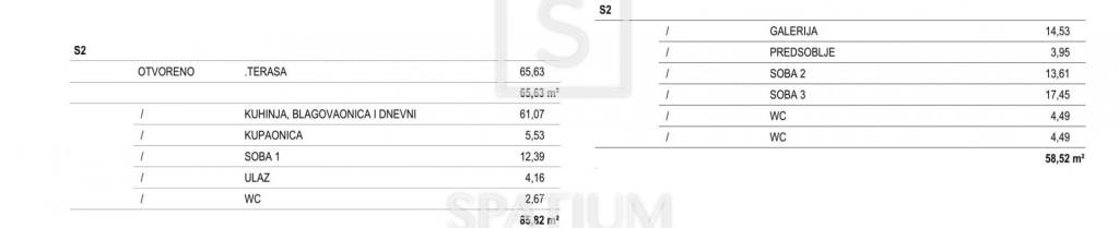 The apartment extends over two levels, with a total area of approximately 150 m². On the ground floor there is a spacious terrace of 68.29 m², an open-plan living area with kitchen and dining room of 61.09 m², one bedroom, bathroom, entrance hall and separate WC, totaling 86.27 m² of interior space. The gallery level features two additional bedrooms, two bathrooms and a gallery area of 63.24 m², offering a comfortable layout for family living or hosting guests.
