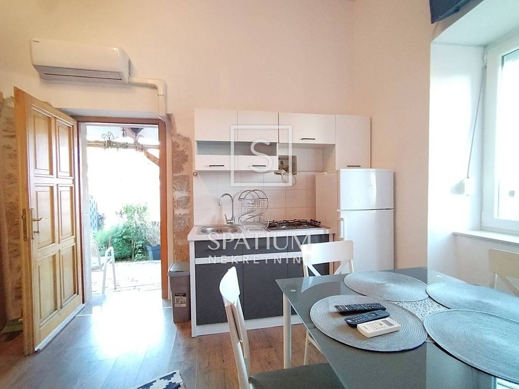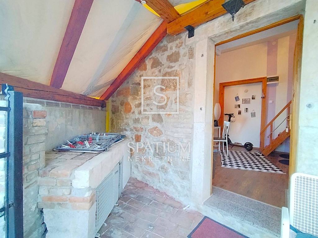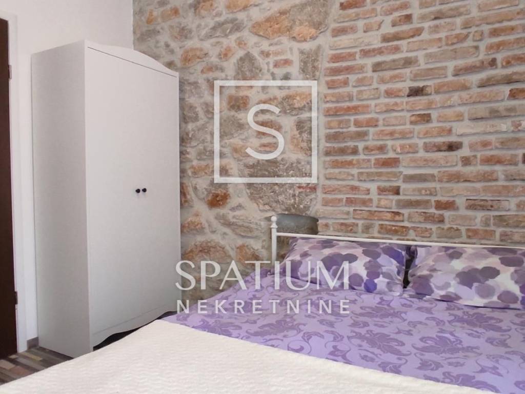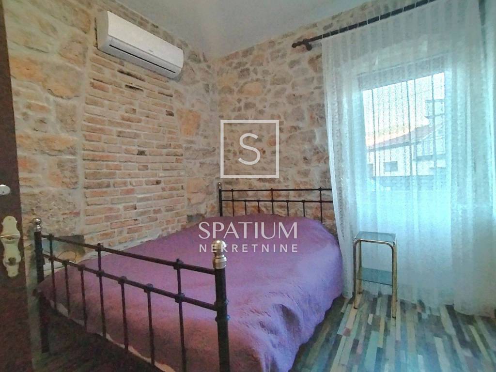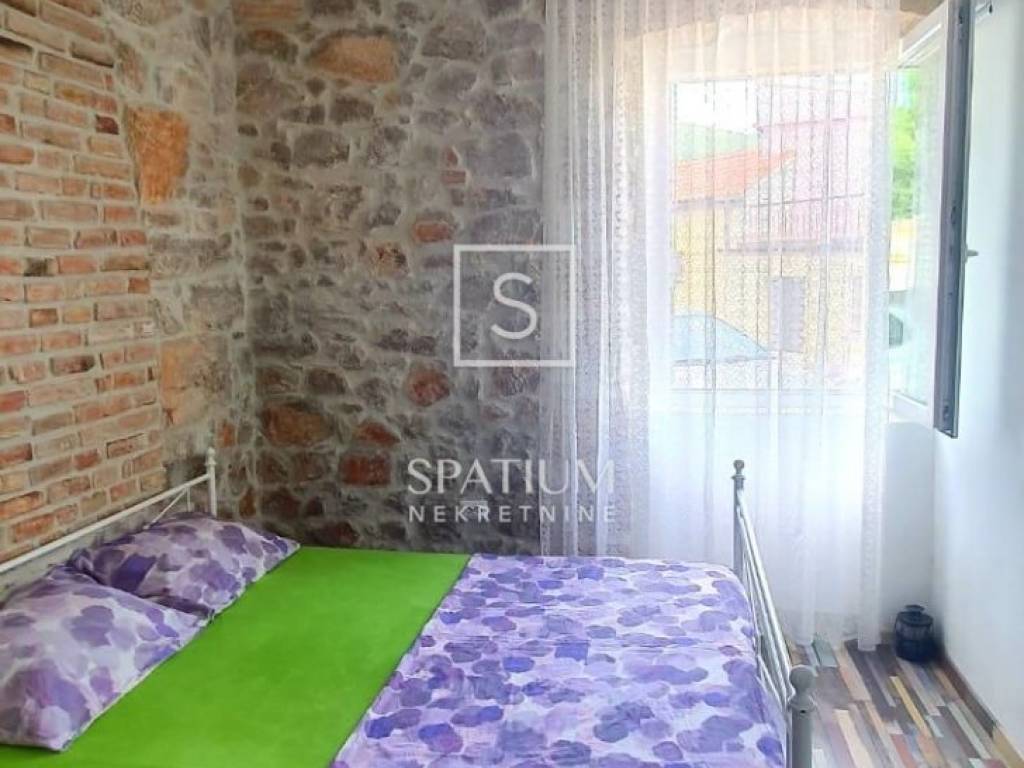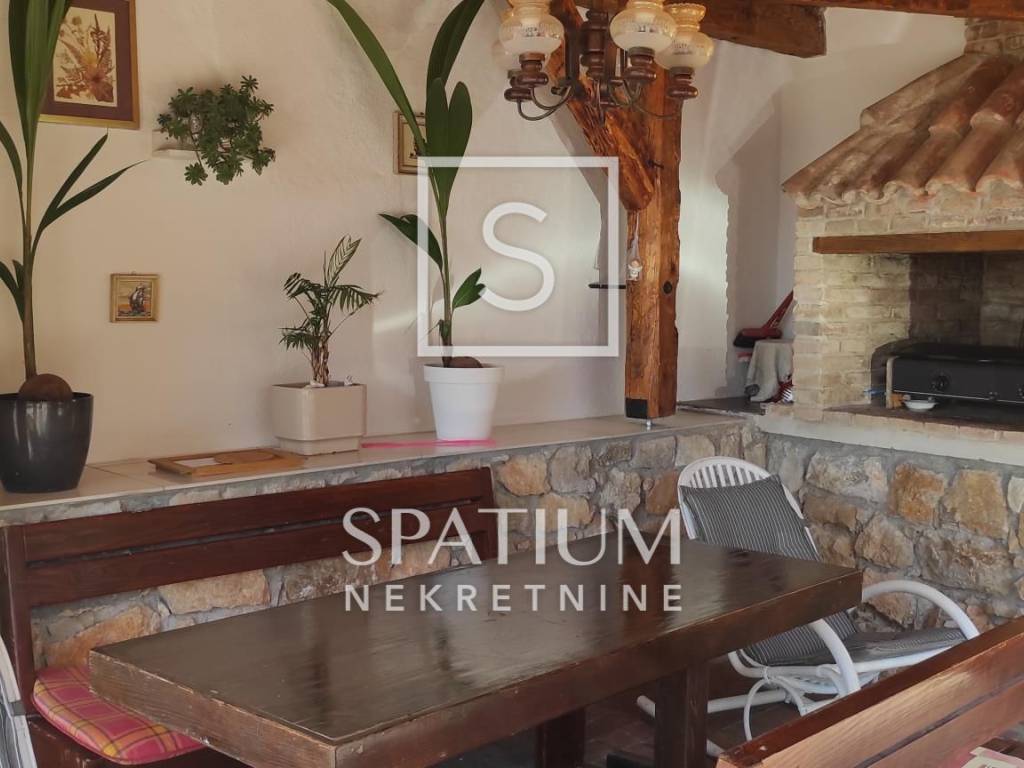 We have received two apartments in the house, which are divided into two separate units on the ground floor. The first apartment of 38 m2 contains a hallway, kitchen, hall with bedroom and bathroom, and a covered terrace with a grill. The second apartment is a studio of 20 m2 which contains a kitchen with a dining area, a bed and a small gallery with another bed and a bathroom. The apartment also has a covered terrace and a small grill. On the fenced plot of 80 m2 there are parking spaces for three cars, and in the yard there is a wooden gazebo that serves as a storage room. This is an ideal property for investing in tourism, as well as for long-term living. The property is 800 m from the sea and all important amenities.
