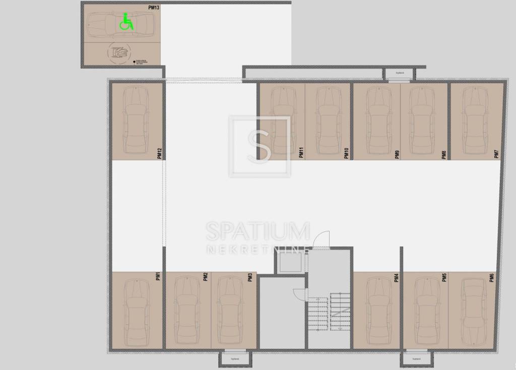 The underground level features a garage with a total of 13 parking spaces, including one reserved for persons with disabilities. In front of the building, there are an additional six outdoor parking spaces.
