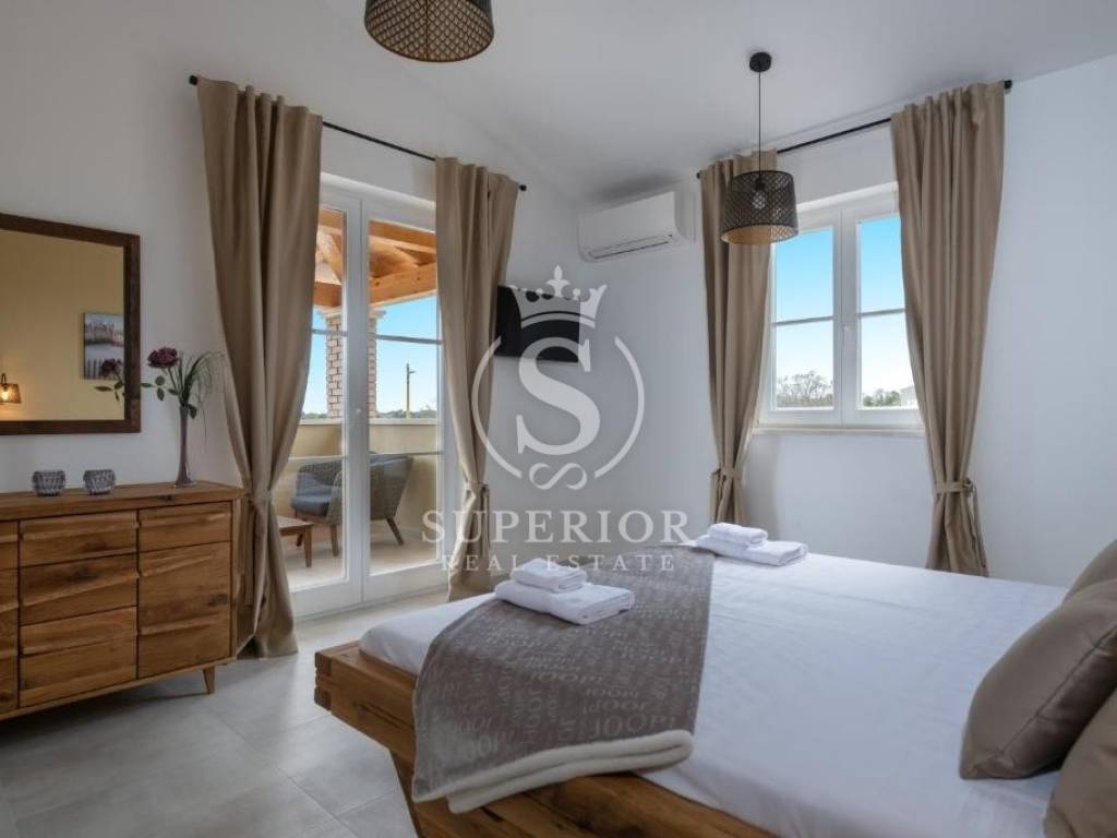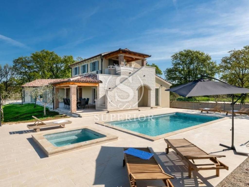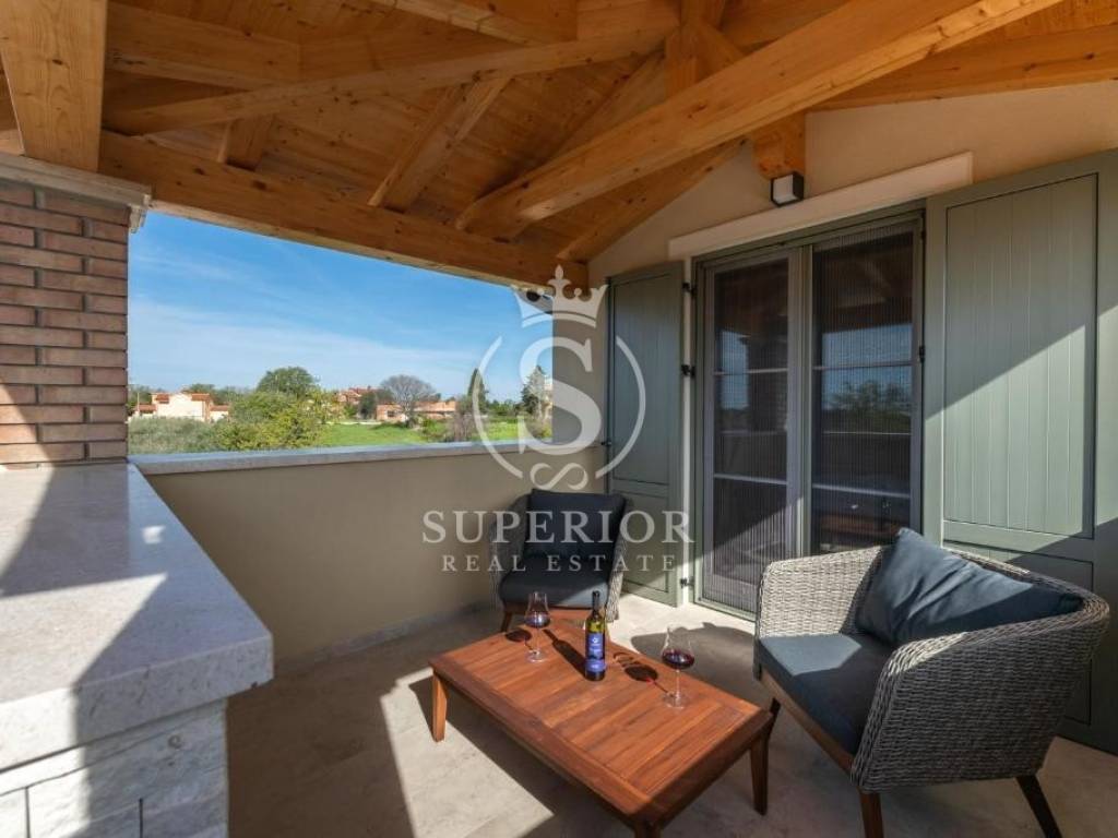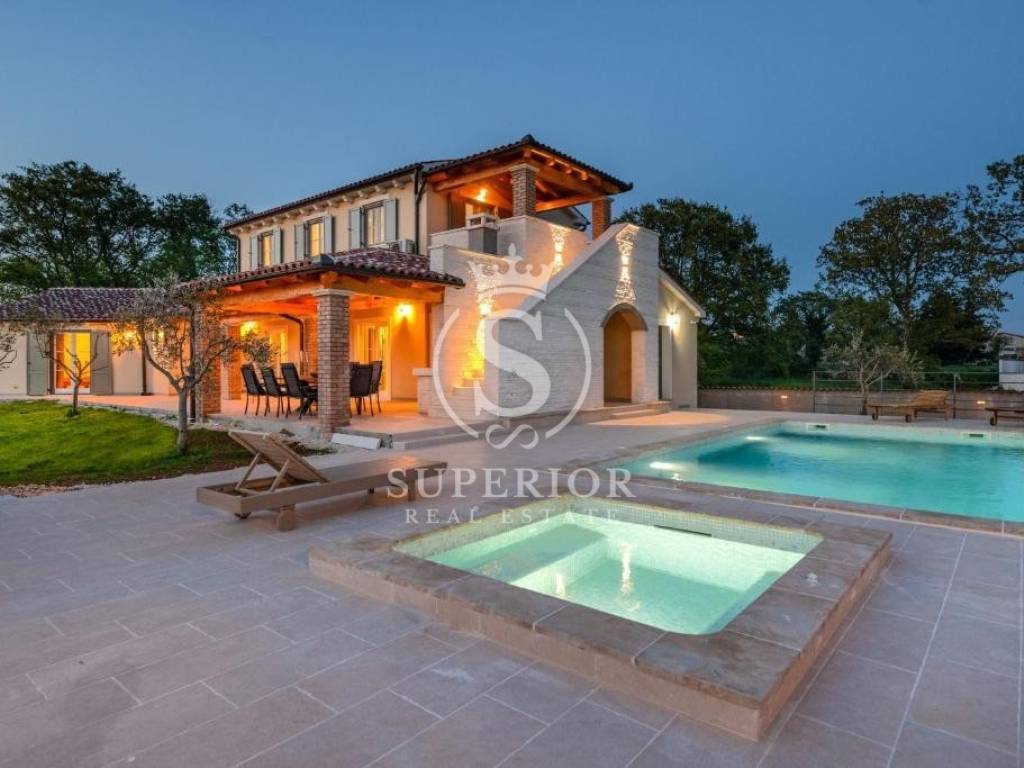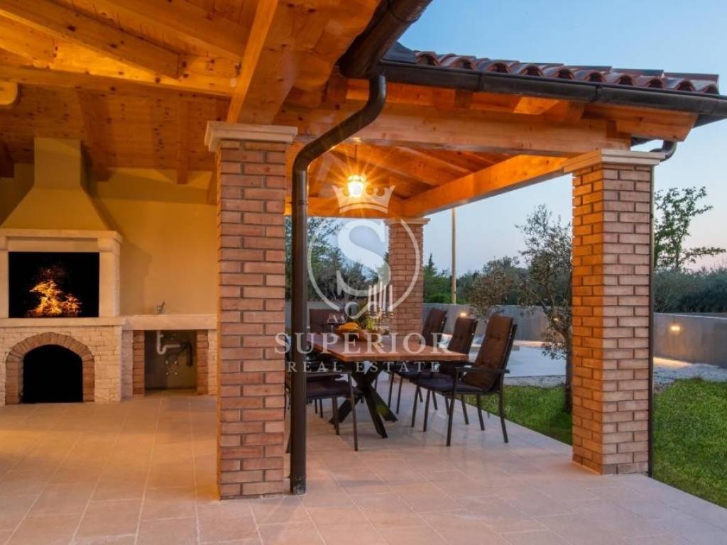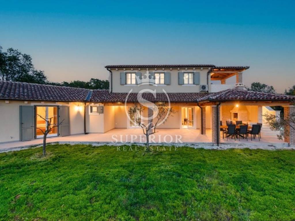 In a peaceful location, just 20 km from Pula and 2 km from the sea, a newly built luxury villa is for sale. It is situated on the edge of a small tourist village, with a newly asphalted access road and surrounded by olive groves. There are 11 planted olive trees on the property, creating a Mediterranean atmosphere and complete privacy.
