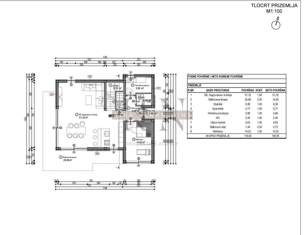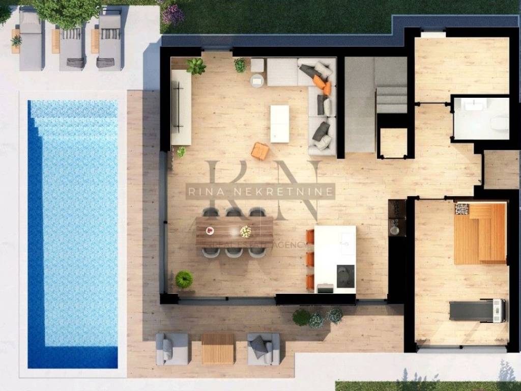 Ground floor: entrance hall, spacious living room with kitchen and dining area, WC, wellness area (which can easily be converted into an additional bedroom), technical room, and storage.