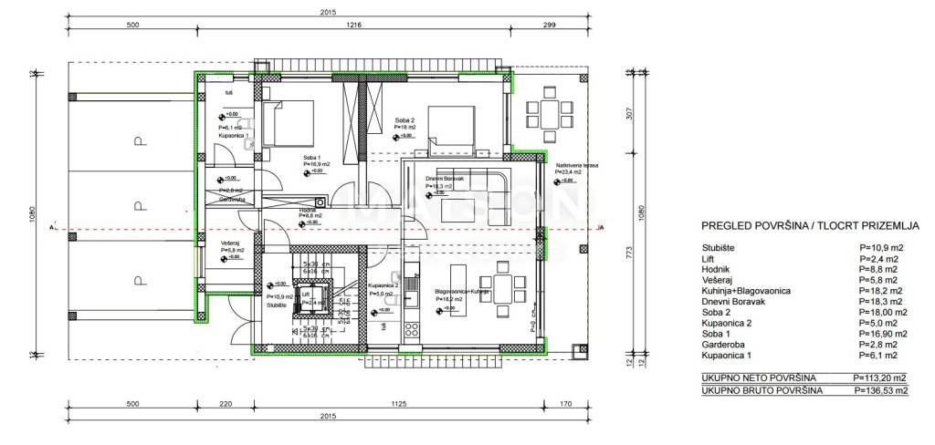 The apartment is situated on the ground floor with a net area of 113.2 m². A 23.4 m² terrace perfectly complements the landscaped garden of 150 m², which includes a private pool. This outdoor space offers an ideal setting for relaxation and enjoyment.