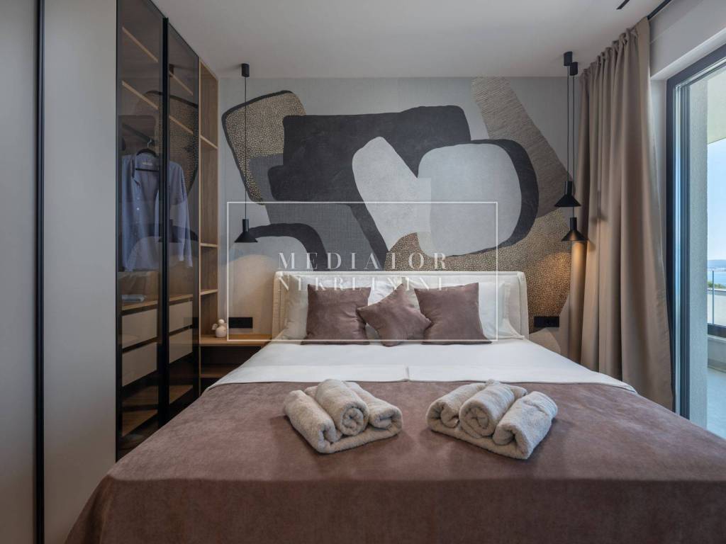 An internal staircase leads to the upper floor, where there are three spacious bedrooms, each with its own private bathroom and access to a balcony with sea views. The rooms are thoughtfully furnished and equipped to provide maximum comfort and luxury.
