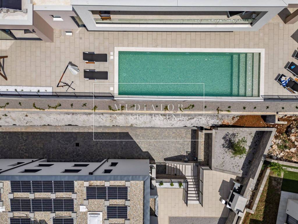 On the ground floor, there is a spacious living room elegantly connected to the kitchen and dining area, with direct access to a covered terrace featuring a summer kitchen, sun deck, and outdoor pool. This level also includes one bedroom, a walk-in closet, a modern bathroom, a laundry room, and an exclusive wellness area with a sauna and heated indoor pool—offering added value even in the winter months.