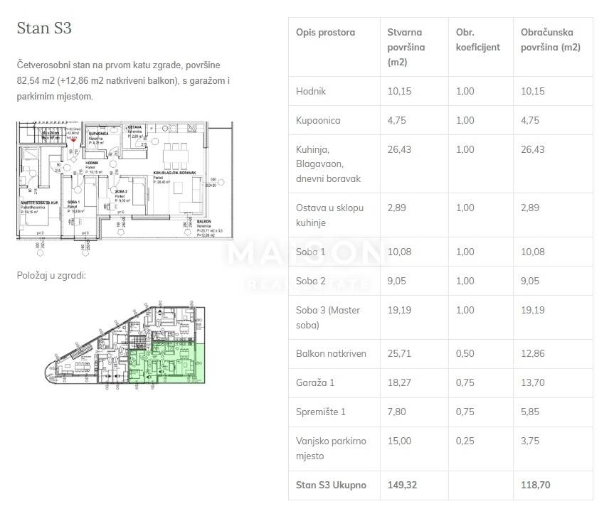 Apartment S3 is located on the first floor, offering 82.54 m² of interior living space and an impressive 25.71 m² covered balcony. The layout includes three bedrooms, a spacious open-plan living room with kitchen and dining area, two bathrooms, a garage, one outdoor parking space, and a private storage unit. It’s the ideal home for a family seeking comfort, functionality, and a large outdoor space for year-round enjoyment.