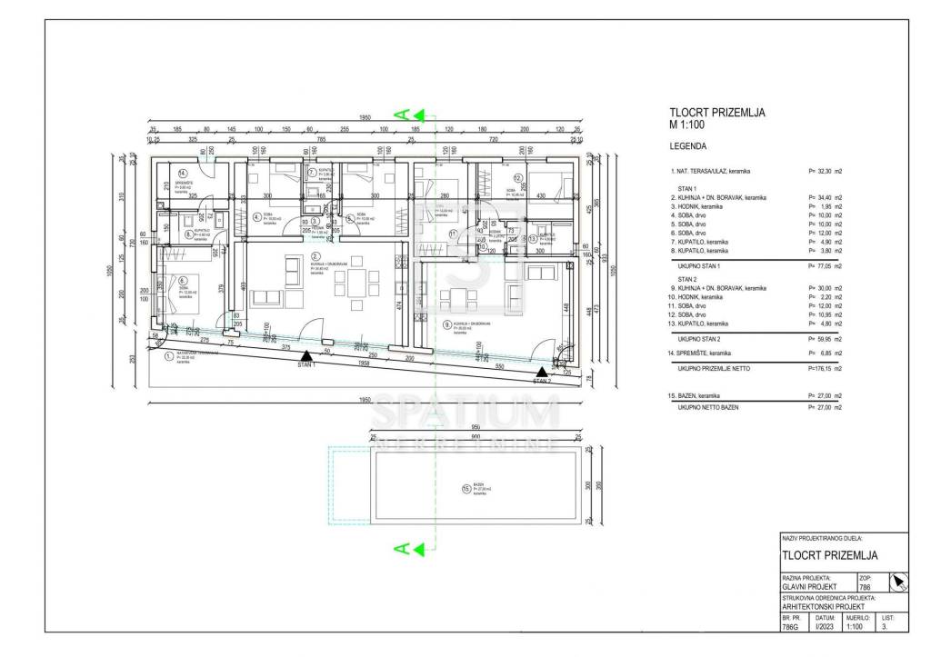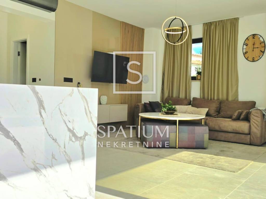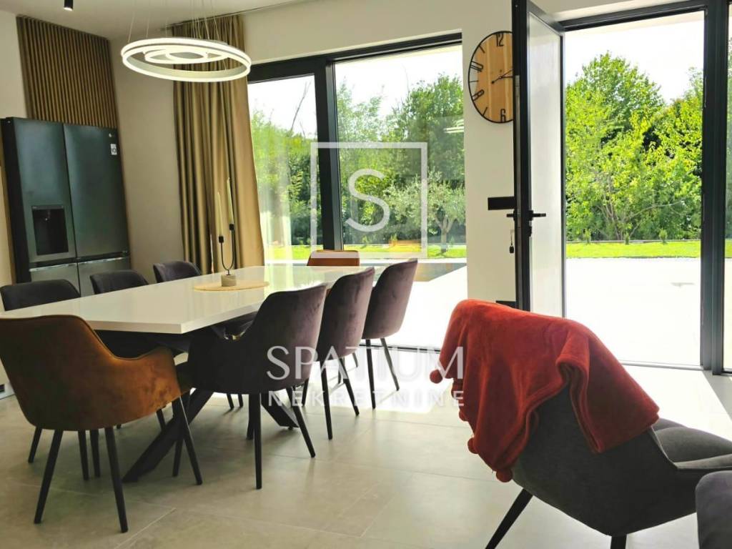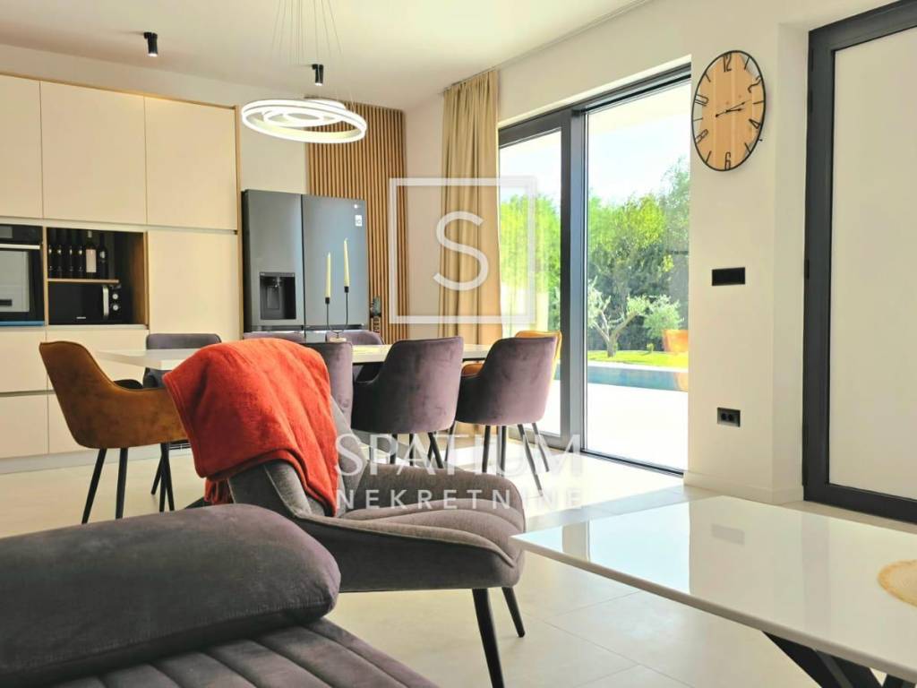 LABIN, In the vicinity of Labin, a modern ground-floor villa with a total living area of 176 m² is offered for sale. The main residential unit consists of an entrance area, open-plan living room with kitchen and dining space, three bedrooms, two bathrooms, and a storage room. Adjacent to the main house is a separate apartment, which forms an independent living unit with a living room, kitchen, two bedrooms, and a bathroom.