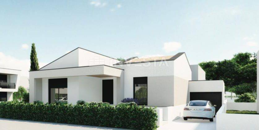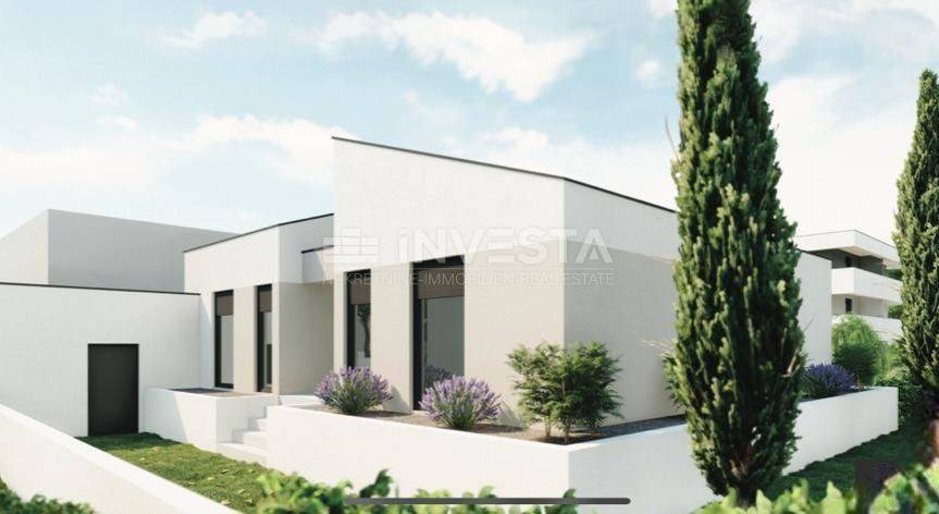 A single-storey house with a garage is for sale in the suburbs of Pula. It is located in a quiet location, in a neighborhood of family houses. The total gross construction area is 125 m2 with a garage of 23 m2 BGP. It was built on a plot of land of 336 m2. The house consists of a hallway, bathroom, toilet, two bedrooms, kitchen with dining room and living room with access to the terrace. The house is currently in a high roh-bau phase of construction. The price refers to a completely finished house according to the "turnkey" principle.