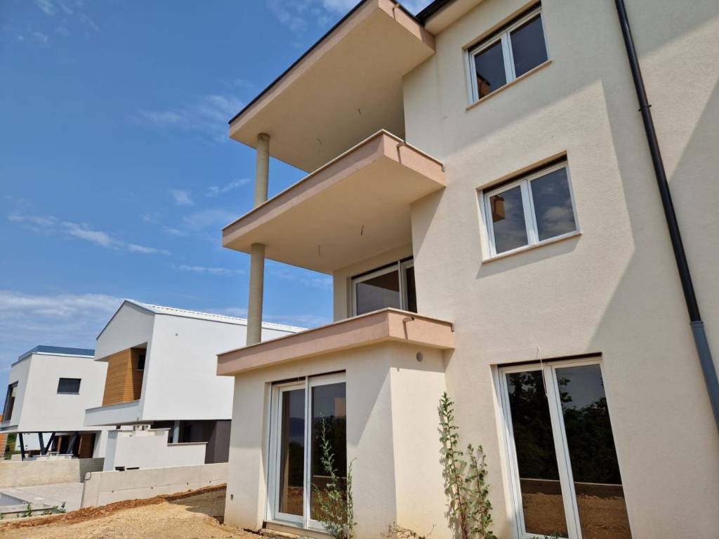 An apartment is for sale in Njivice, located just 500 meters from the sea. Situated on the 1st floor of a new building, the total living area is 77.14 m². It consists of a living room with a kitchen and dining area, two bedrooms, a bathroom, a separate toilet, and two terraces – one accessible from the living room and the other from a bedroom. The apartment features an open sea view, underfloor heating, air conditioning, PVC joinery, security doors, and an assigned parking space. All documentation is in order, and the occupancy permit and condominium registration are in progress.