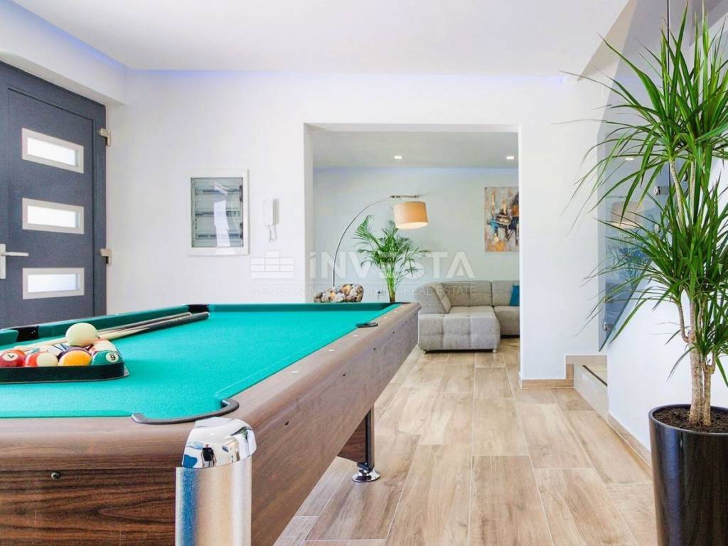 The villa spans two levels; the ground floor includes a hallway with a billiard table, guest WC, a spacious living room, kitchen, dining room, and a bedroom with its own bathroom. From the ground floor, there is access to a covered terrace and garden, and an internal staircase leads to the first floor. On the first floor, there are four modern bedrooms, each with its own bathroom, and three rooms also have private balconies.