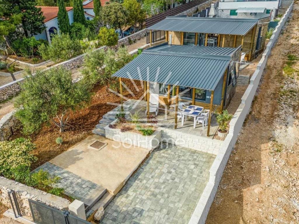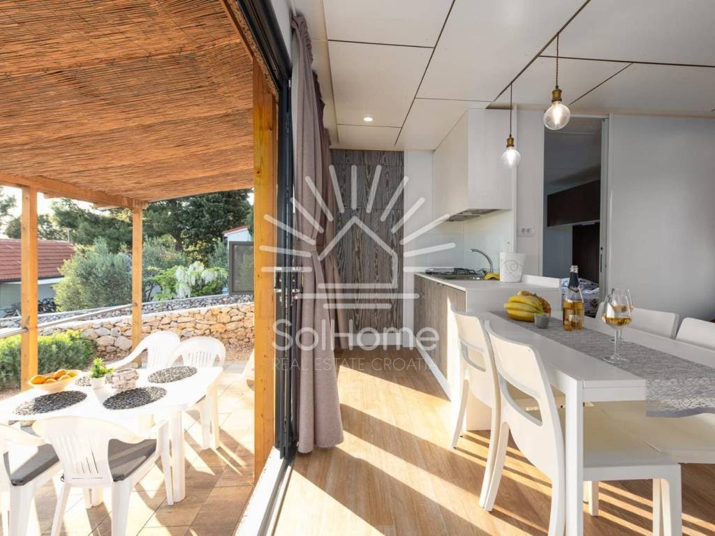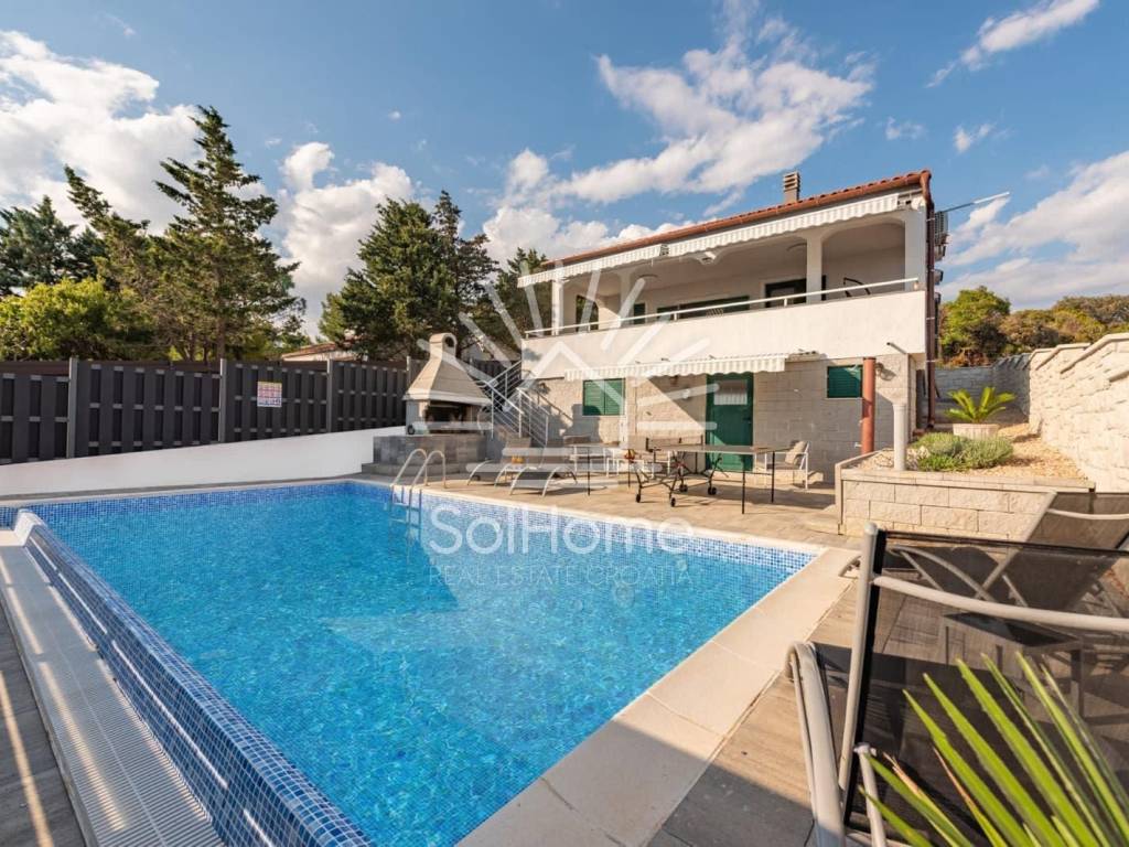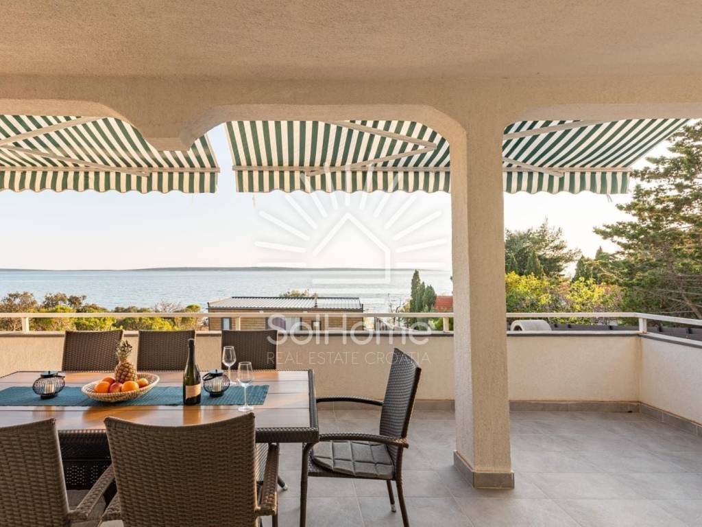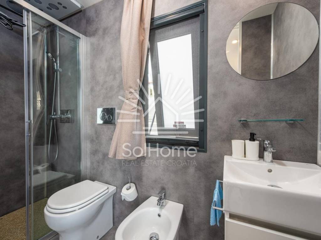 For sale is an impressive property in the Zadar region, covering an area of 163 m², located in an exceptional seafront location. The estate stretches across 518 m² and features a magnificent infinity swimming pool and a spacious garden.