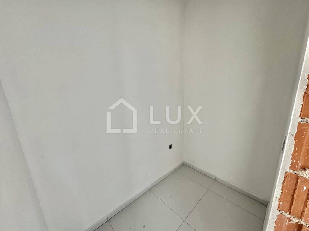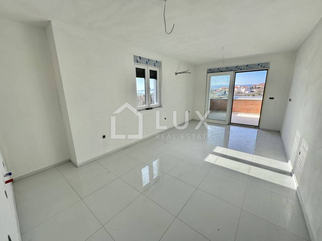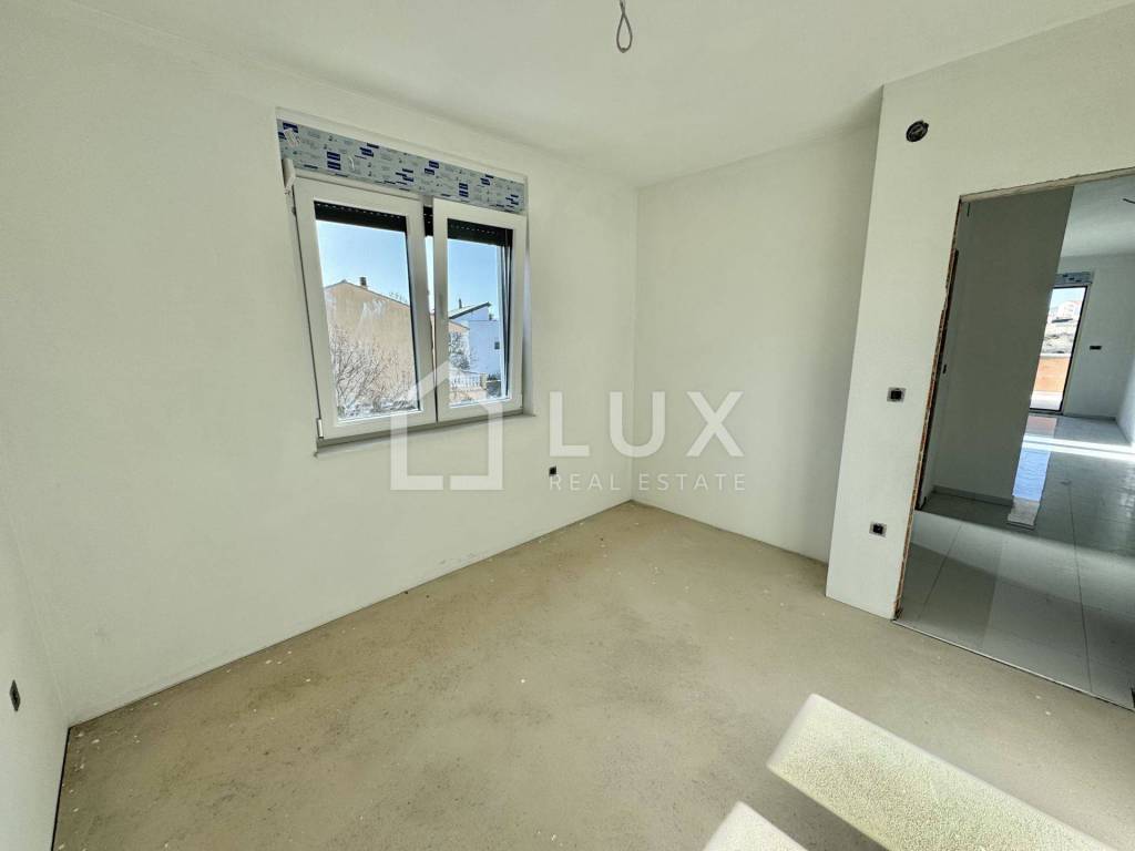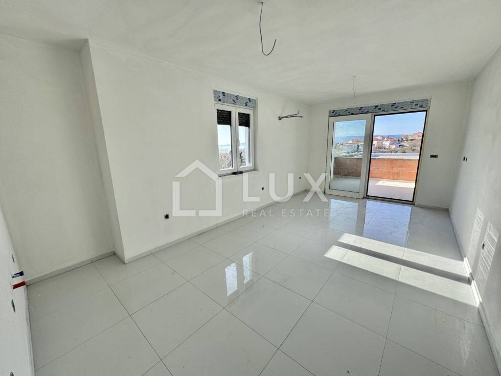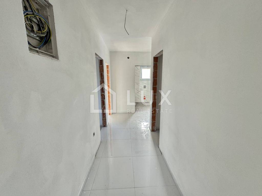 The apartment is located on the 2nd floor of a small residential building and consists of an entrance hall, an open-plan living room with a kitchen and dining room, a bathroom, two bedrooms, a utility room and a spacious loggia with a sea view. The apartment also has one parking space.