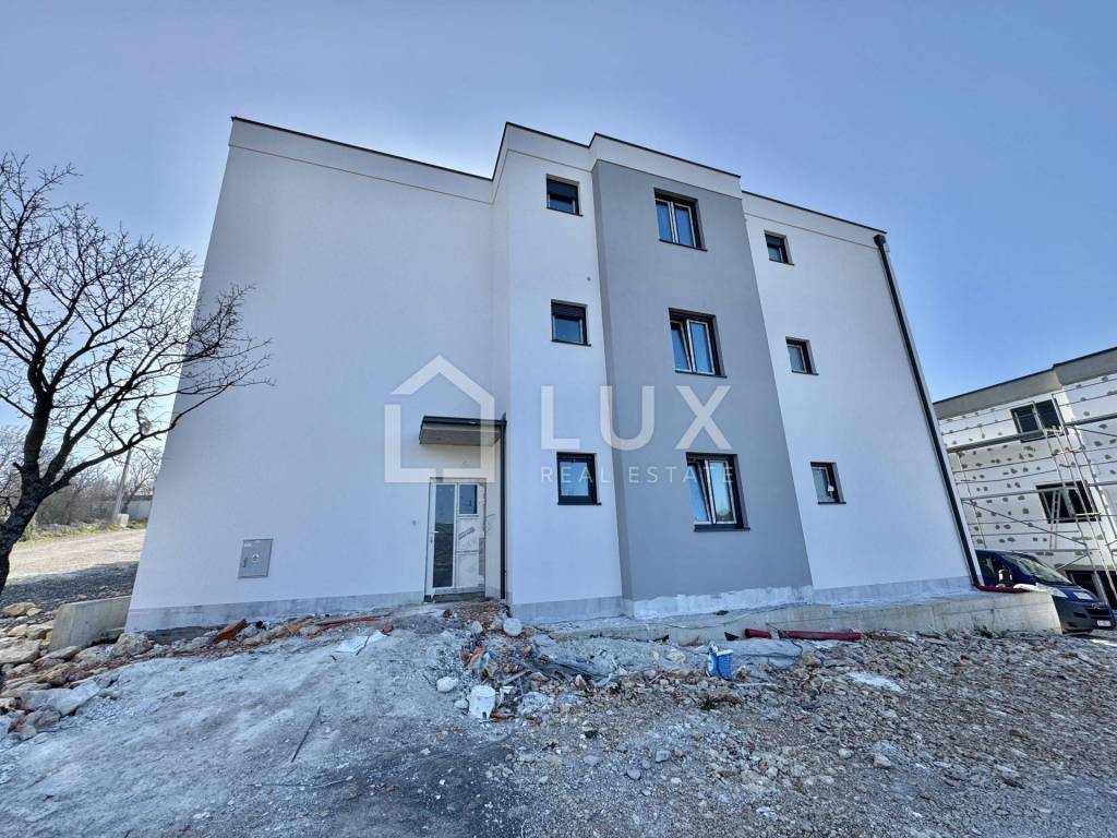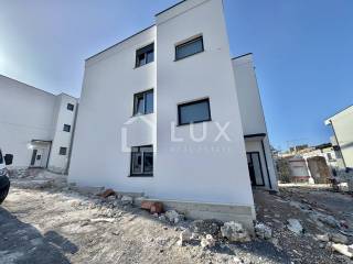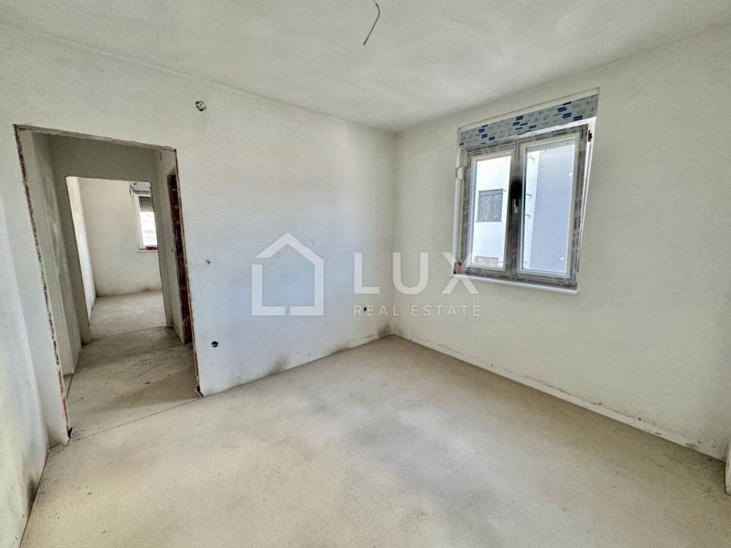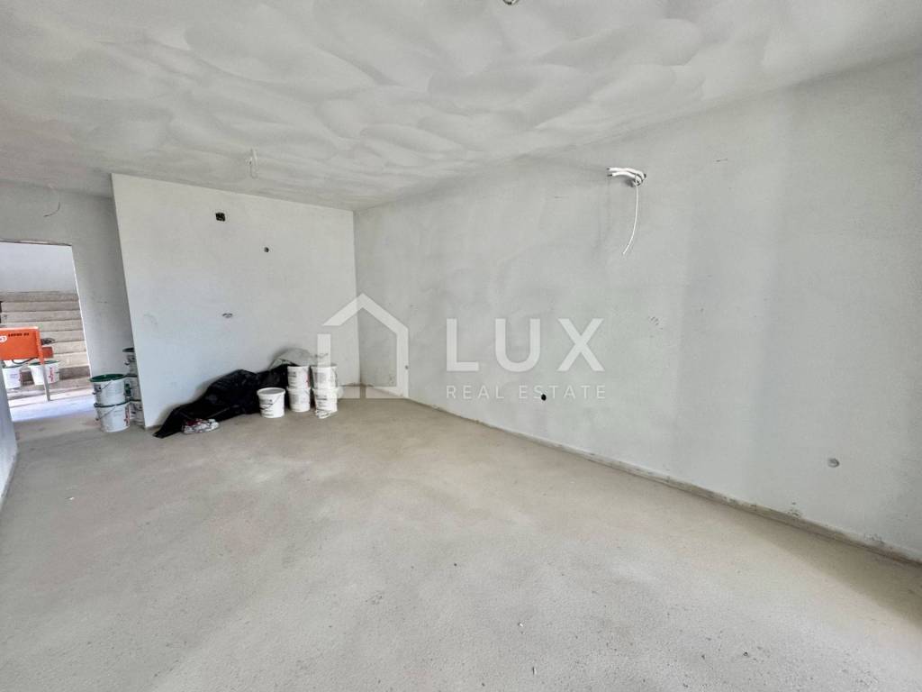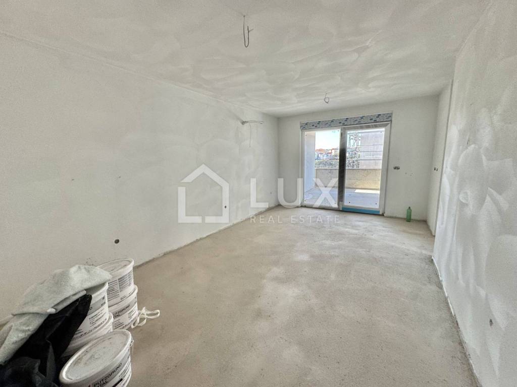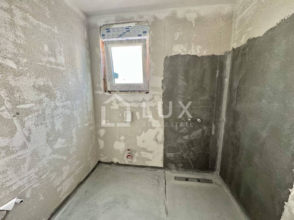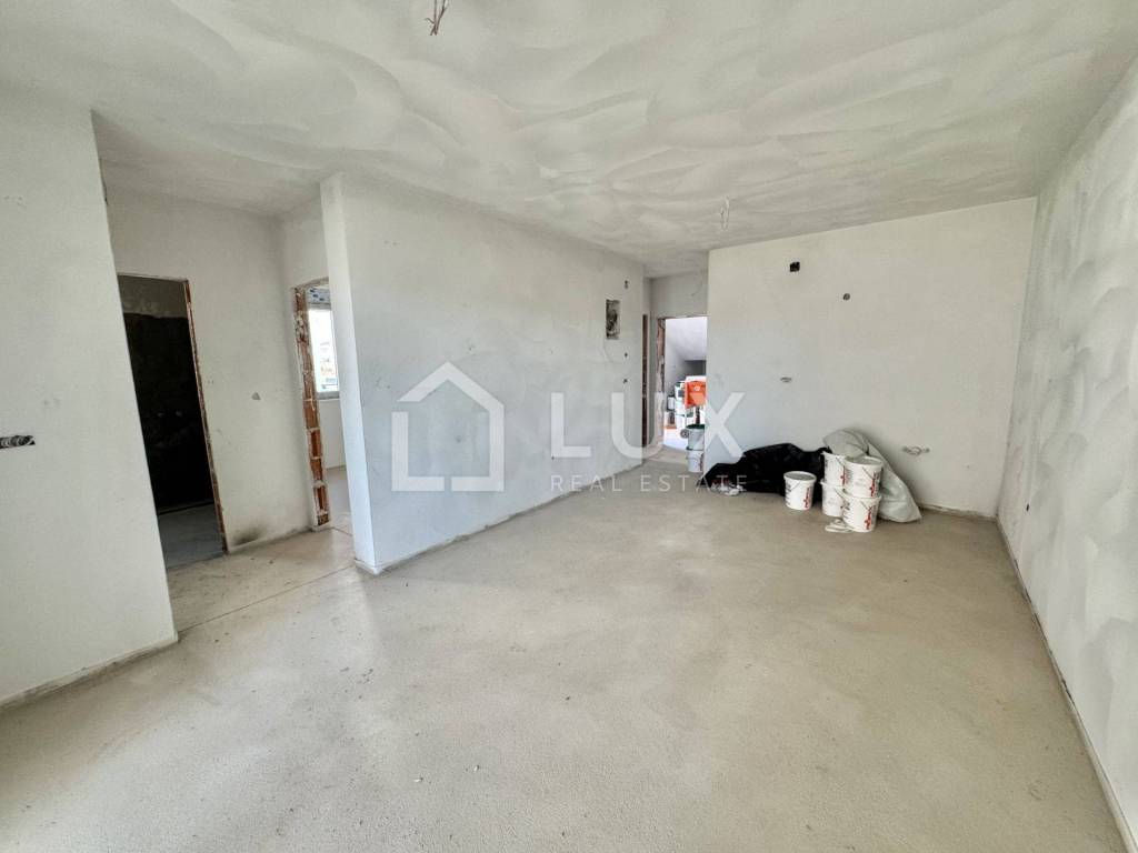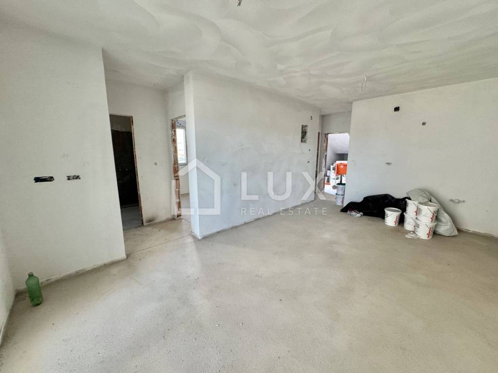 The apartment is located on the ground floor of a small residential building and consists of an entrance hall, an open-plan living room with kitchen and dining room, a bathroom, two bedrooms, a utility room and a spacious loggia with a sea view. The apartment also has one parking space.