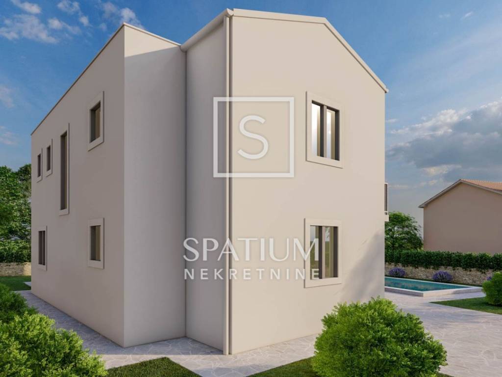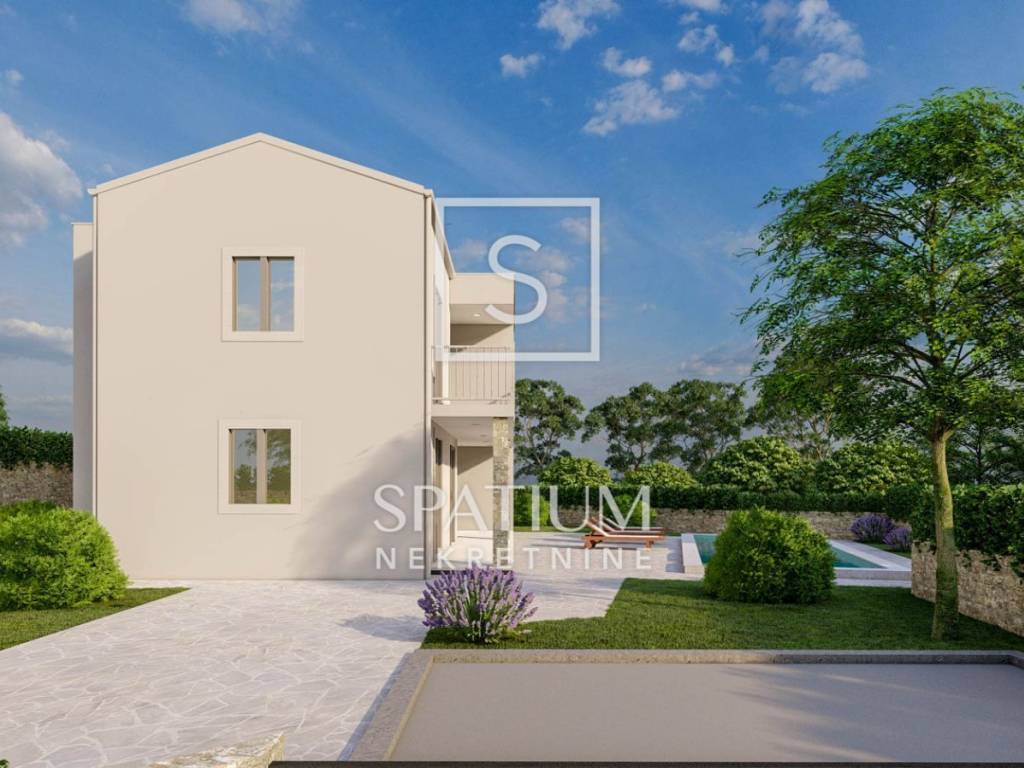 PIĆAN, we are pleased to present a beautiful two-storey house with a total area of 181 m², situated in a peaceful and elevated location offering open views of the surrounding hills and greenery. The ground floor features a kitchen, dining room and living area with a fireplace, a guest toilet, and a covered terrace with a summer kitchen. An internal staircase leads to the upper floor where there are three bedrooms, two bathrooms, and an additional storage room. The house will be finished with ceramic tiles, while laminate flooring is planned for the bedrooms. Heating is possible with wood, pellets, or electricity, and for added comfort, there is an air conditioning unit. In front of the house, the yard includes a swimming pool and a sunbathing area. The property is sold “turnkey”, without furniture or equipment, and comes with a landscaped garden.