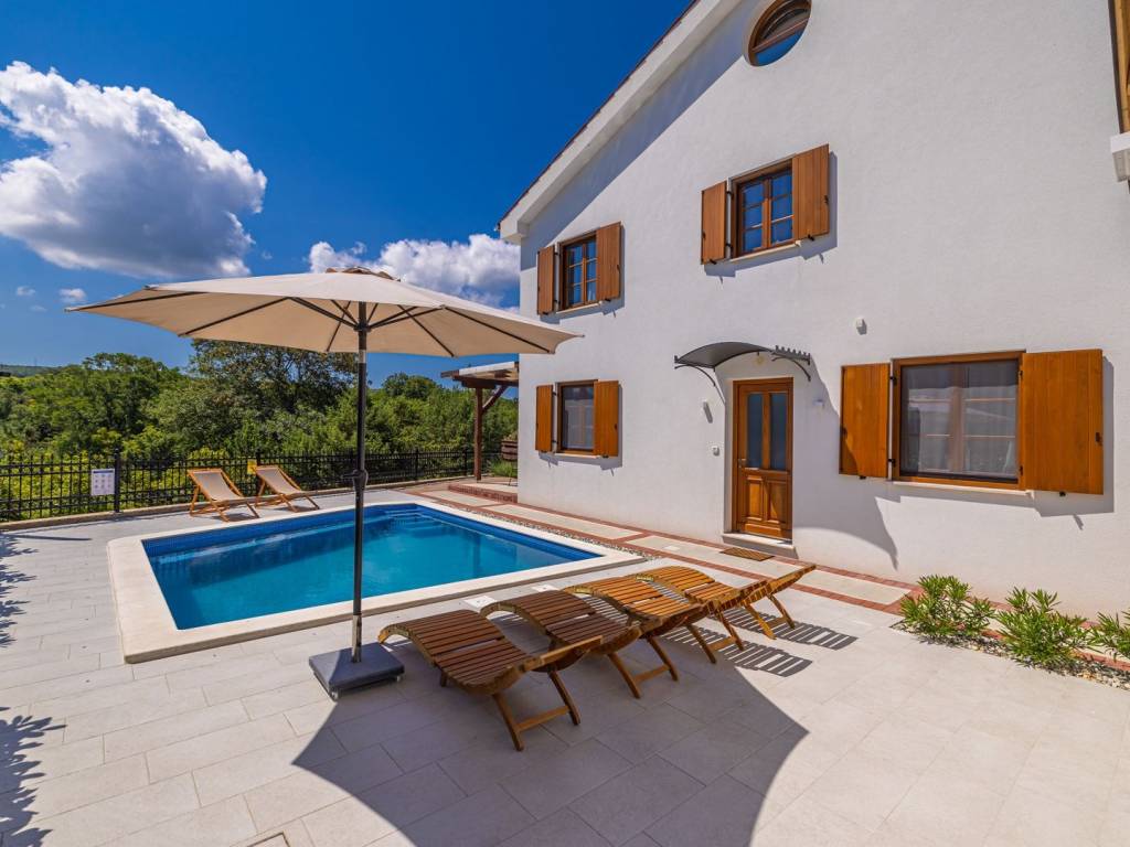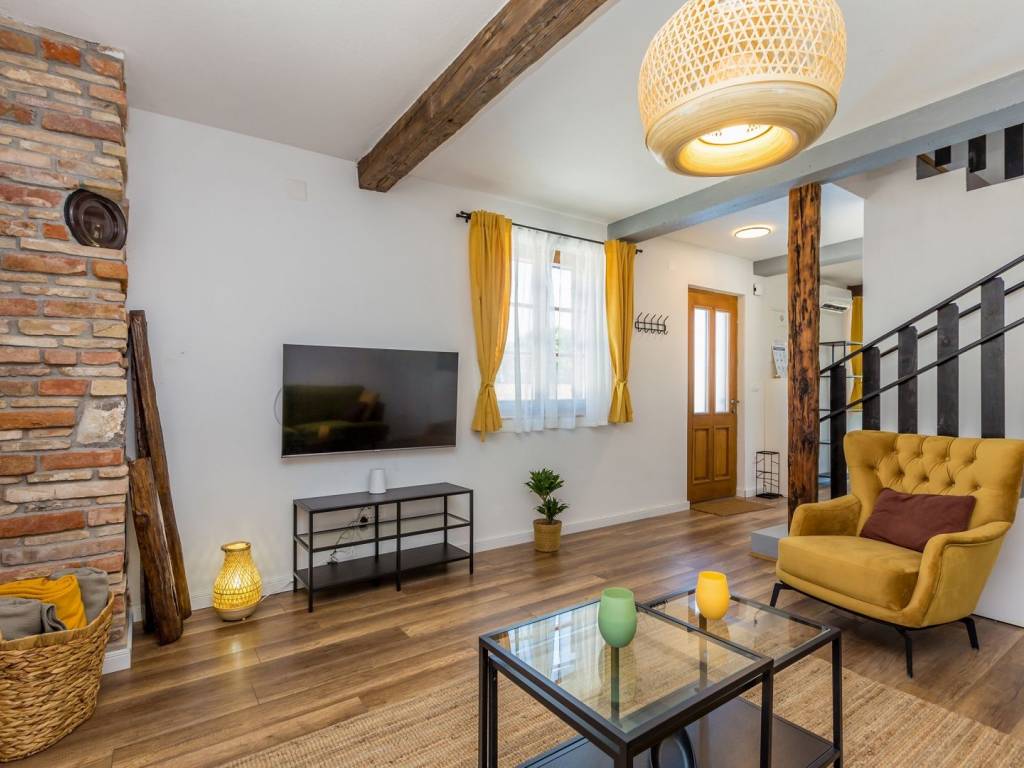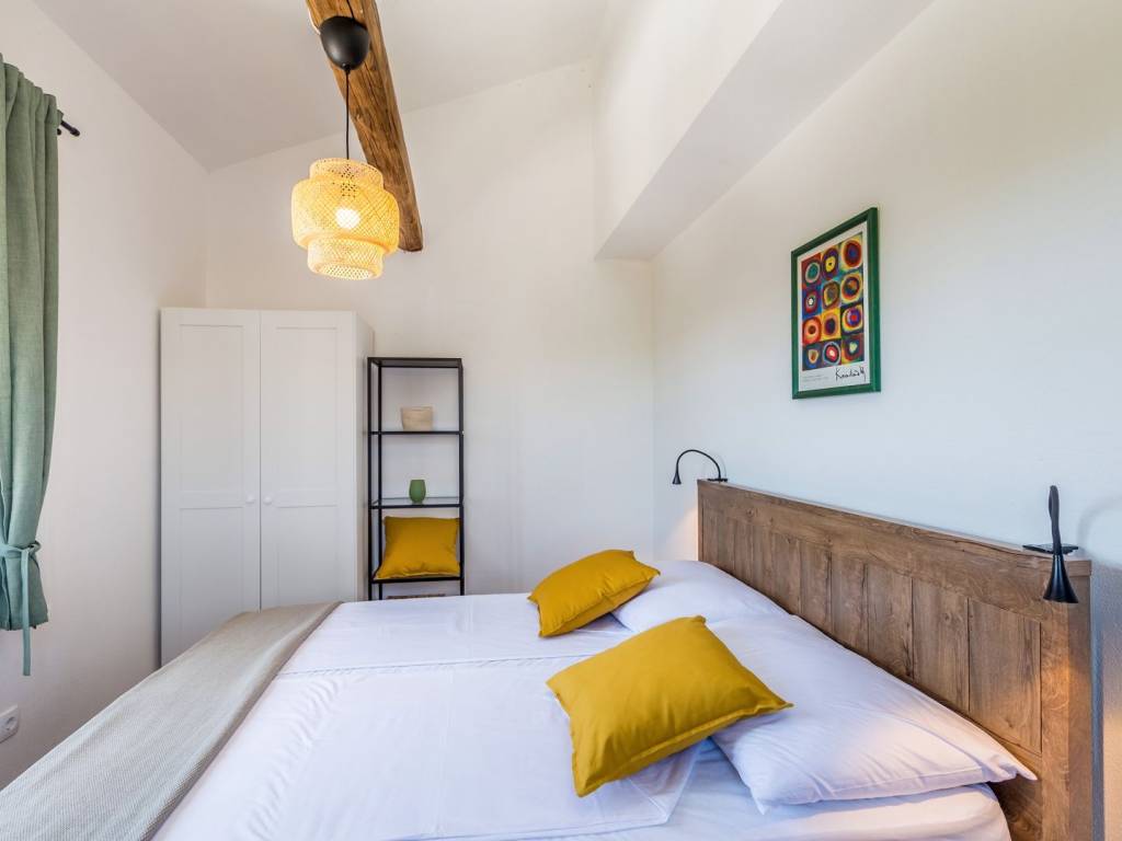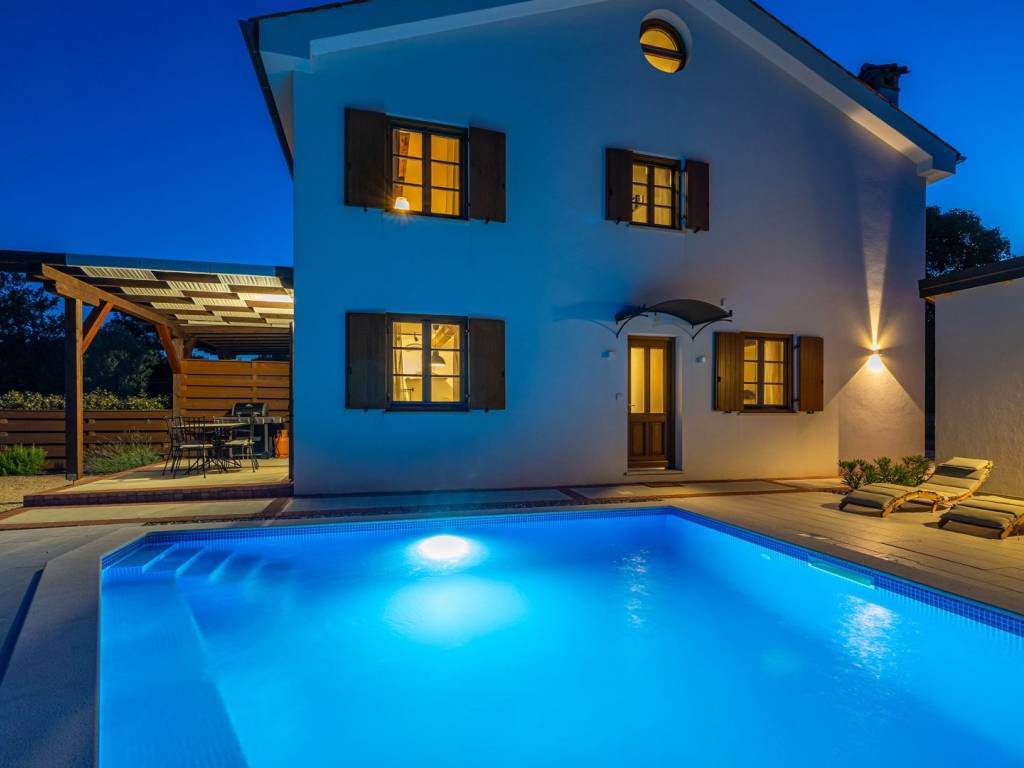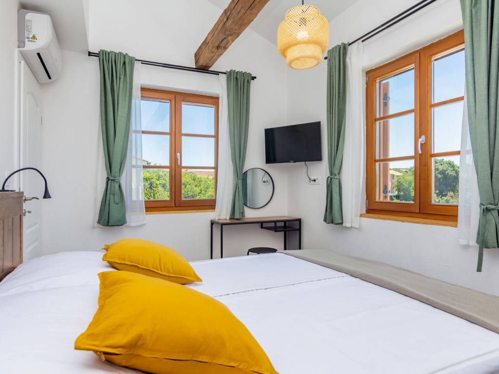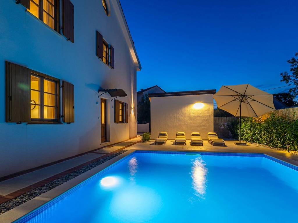 KRK ISLAND, MALINSKA - Semi-detached house with swimming pool for daily rent Adriatic Dream Holiday Home is designed as a combination of Mediterranean style with modern industrial elements. Semi-detached house with private pool consisting of ground floor, first floor and gallery. Swimming pool (size 21.5 m2) is with mild salt water which is perfect combination for keep water crystal clean without adding chlorine. Pool have stairs inside for easier access and also includes sitting bench with jets. On the ground floor there is a living room, a bathroom, a kitchen with a dining room with exit on a terrace and sun deck. On first floor are two bedrooms with double beds and a bathroom. On second floor or gallery is open space with two single beds (200 x 90). Kitchen is fully equipped with toaster, kettle, filter coffee machine, dishwasher etc. Free Wi-Fi. Each bedroom plus living room have their own TV with satellite programs. The house is fully air-conditioned with a total of five air conditioners. Gas barbecue for the guests. Two private parking places. The house is decorated in a way to ensure your pleasant and relaxing stay.