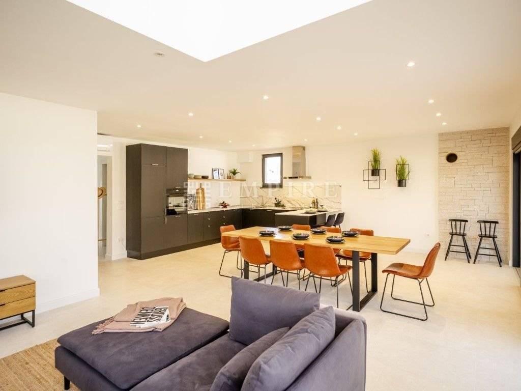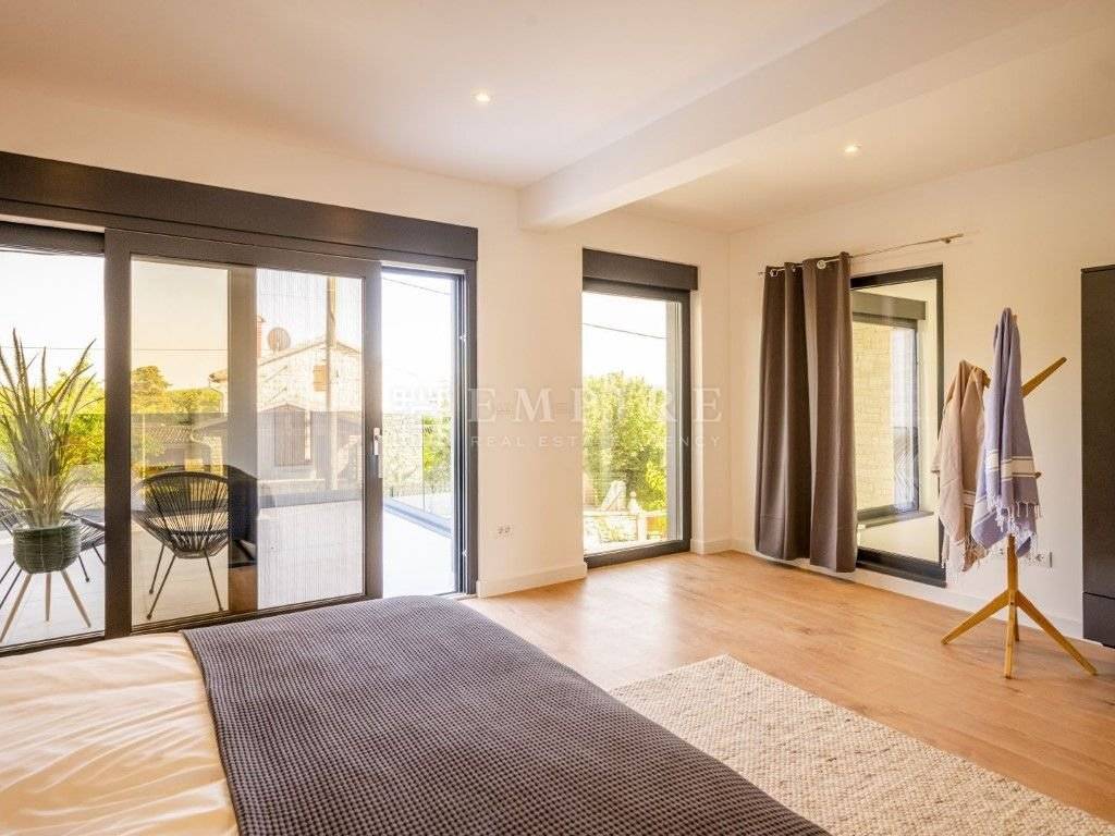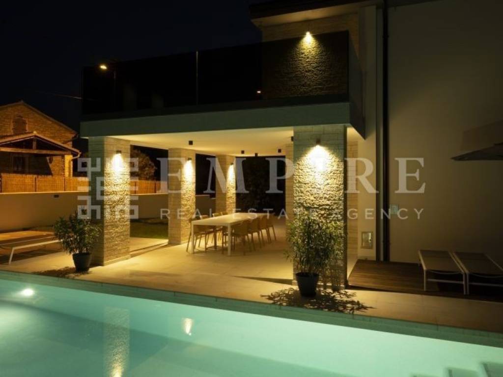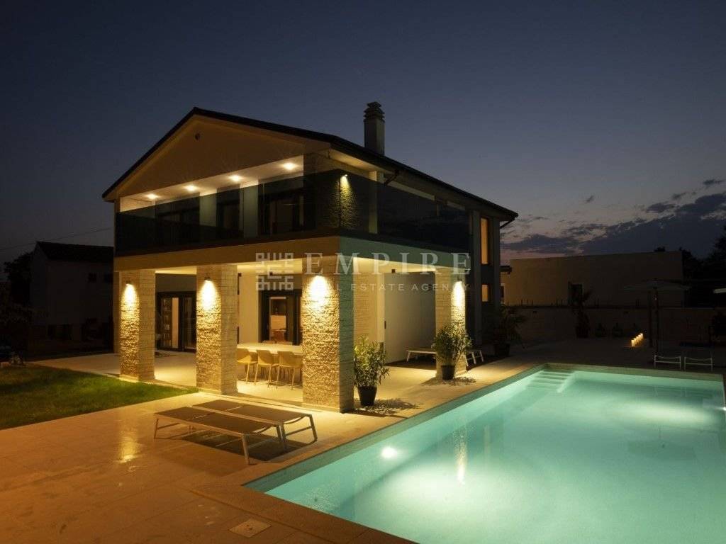 For sale is a modern villa with a heated pool in a quiet neighborhood near the city of Rovinj. The uniqueness of this location is that it is situated in a small, beautiful area surrounded by Istrian and modern villas, and within just ten to fifteen minutes, you can be in the center of Rovinj or on beautiful beaches. The house has a total area of 230 m² and consists of two floors: ground floor and first floor. The ground floor consists of an entrance hall, storage room, bathroom, a bedroom with an en-suite bathroom adapted for people with disabilities, a spacious living room with an open-plan kitchen and dining area with direct access to the covered terrace, and a garden that is ideal for entertaining and relaxing with friends and family. A beautiful, wide staircase leads to the first floor, which consists of three bedrooms and two bathrooms. The master bedroom has an en-suite bathroom and access to a spacious balcony. All rooms are comfortable and air-conditioned, and the living room has the option of installing a fireplace or other heating sources. Heating and cooling are provided by air conditioning, which is more than sufficient as the house is built with high-quality prefabricated construction. The house is fully furnished and equipped and is sold as is. The yard is landscaped and fenced. The house also features a heated pool measuring 11 x 4 m (44 m²) with a sunbathing area. The landscaped yard includes an irrigation system. Some of the features include an electric gate for parking and electric blinds in the house. The house has completed the first phase of video surveillance installations. The bedrooms have parquet flooring, while the rest of the house has ceramic tiles. This villa has three to four parking spaces. There is a charging station for electric cars nearby. This house is an excellent opportunity for family living, luxurious relaxation away from city stress in a Mediterranean climate, or as an investment rental.