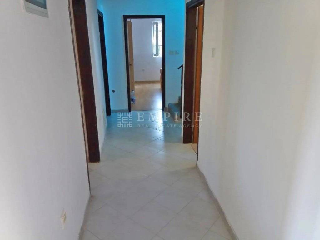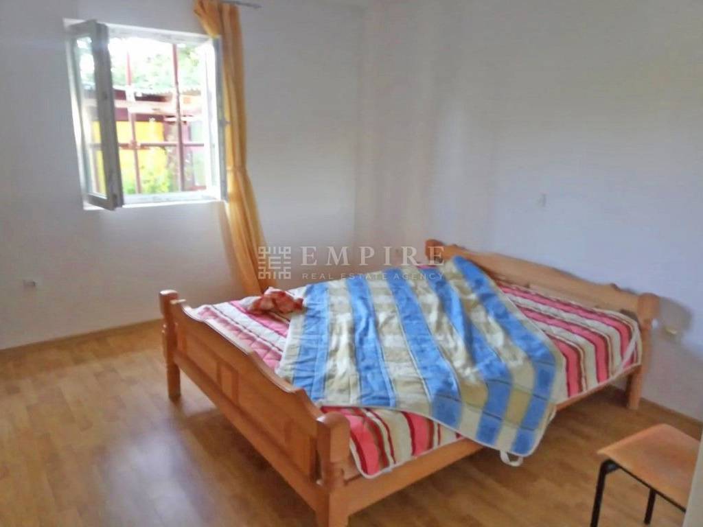The house has 200 m² of living space and is built on a 2324 m² plot. It spans two floors: ground floor and high attic. The ground floor features a smaller apartment consisting of a hallway, living room, kitchen and dining area, bedroom, bathroom, WC, and two storage rooms. The apartment on the upper floor includes a hallway, living room, kitchen and dining area, bathroom, WC, four bedrooms, a balcony, and a covered terrace. Below, there are two garages.