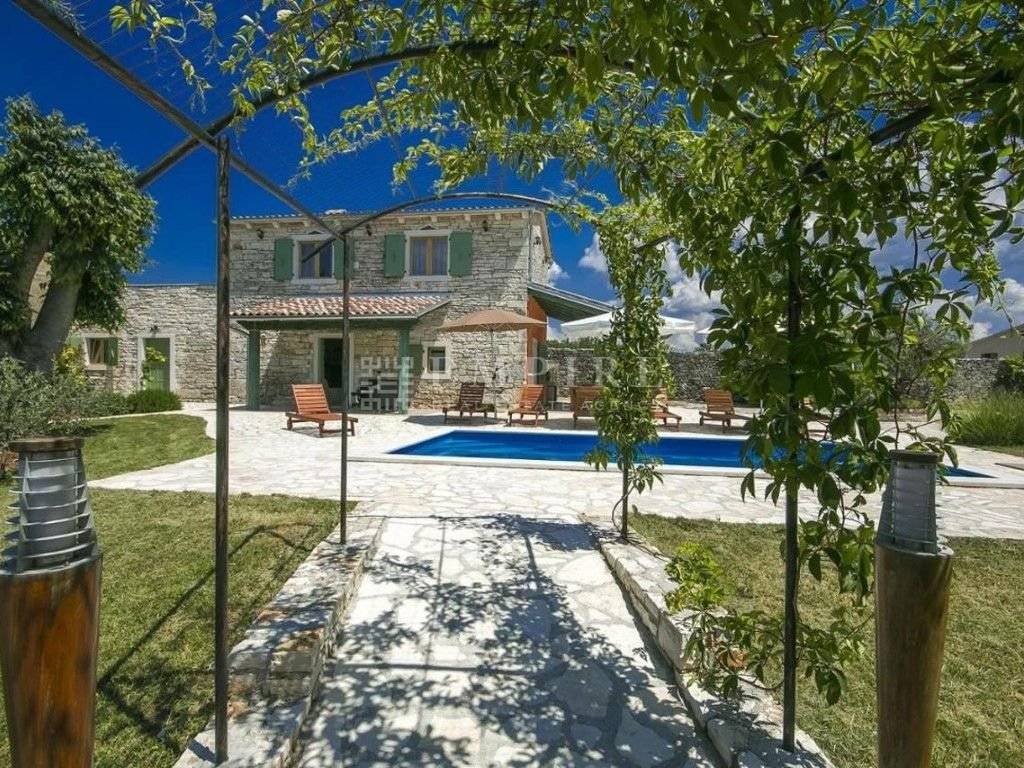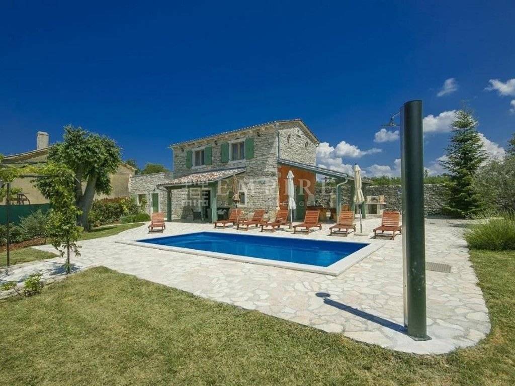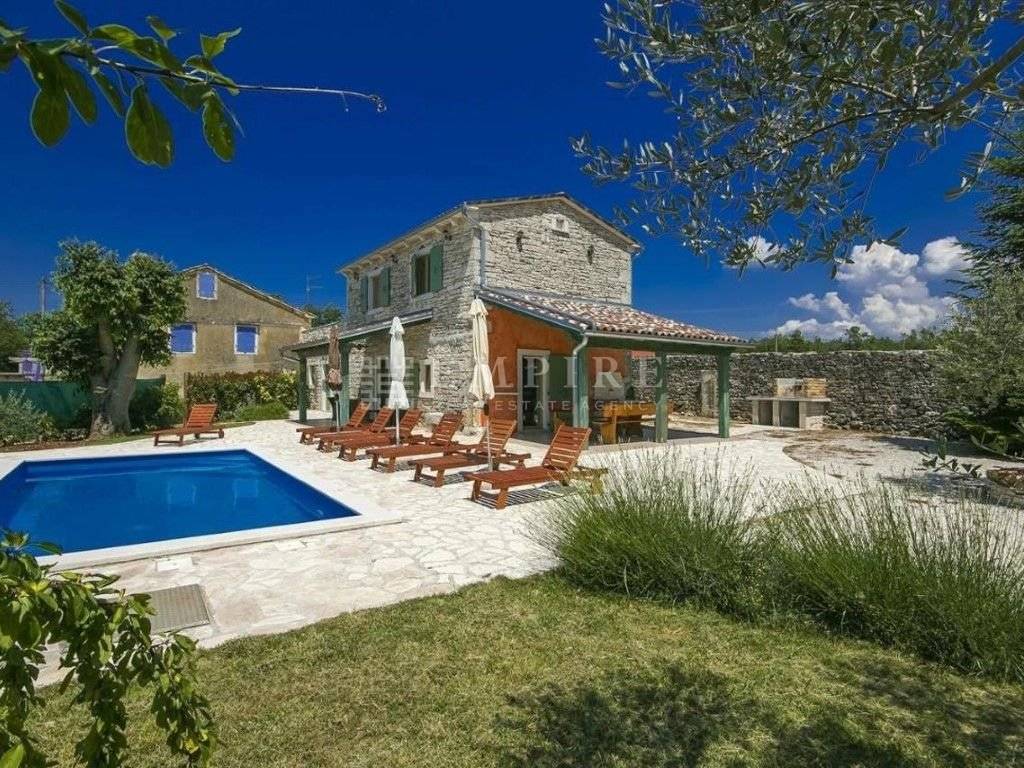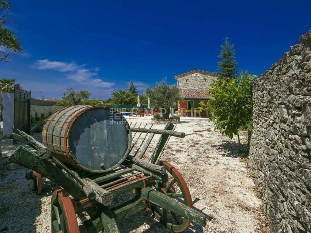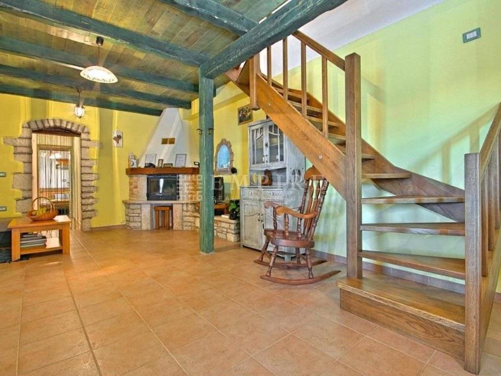 In central Istria, a renovated traditional Istrian house is for sale, along with an additional complex that has been partially renovated. Together, they cover a total area of 1931 m² of land and 345 m² of living space. The stone house with a pool consists of ground and first floors and is located within a fully enclosed yard with several parking spaces. On the ground floor, there is a bedroom with its own bathroom and access to the terrace, a WC, kitchen, dining room, and living room with a fireplace, which leads to a covered terrace with an outdoor dining area. On the first floor, there are two more bedrooms, a shared bathroom, and access to a terrace. The heating/cooling system is controlled by air conditioning and a fireplace in the living room. Next to the renovated stone house with a pool, there is another house that needs partial renovation. It consists of two bedrooms, a bathroom, living room, and kitchen. There are also two cellars and garages. Peaceful location!