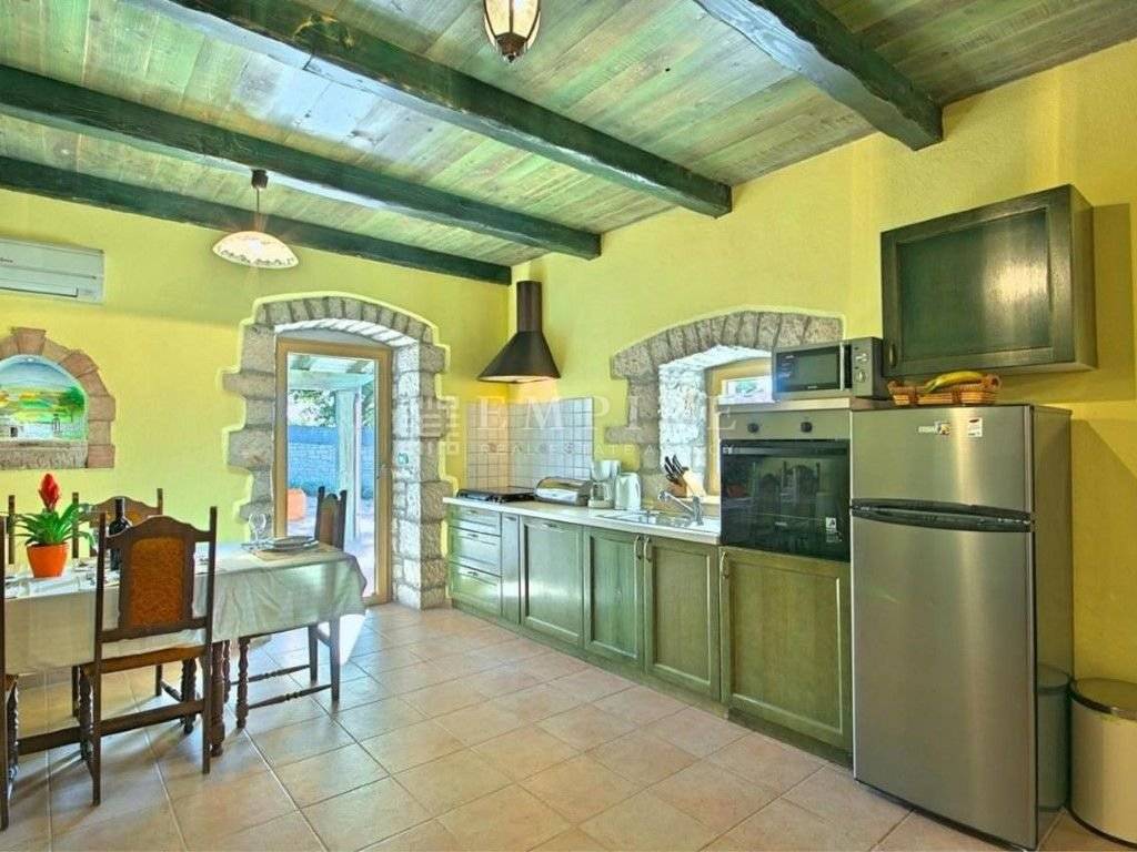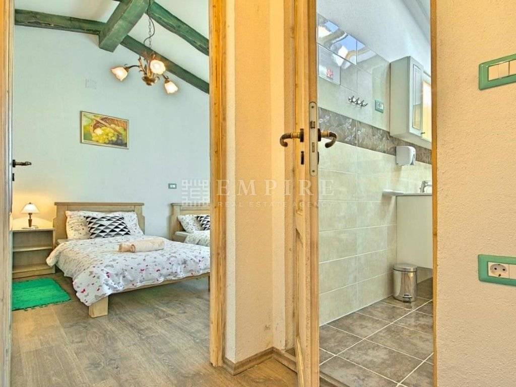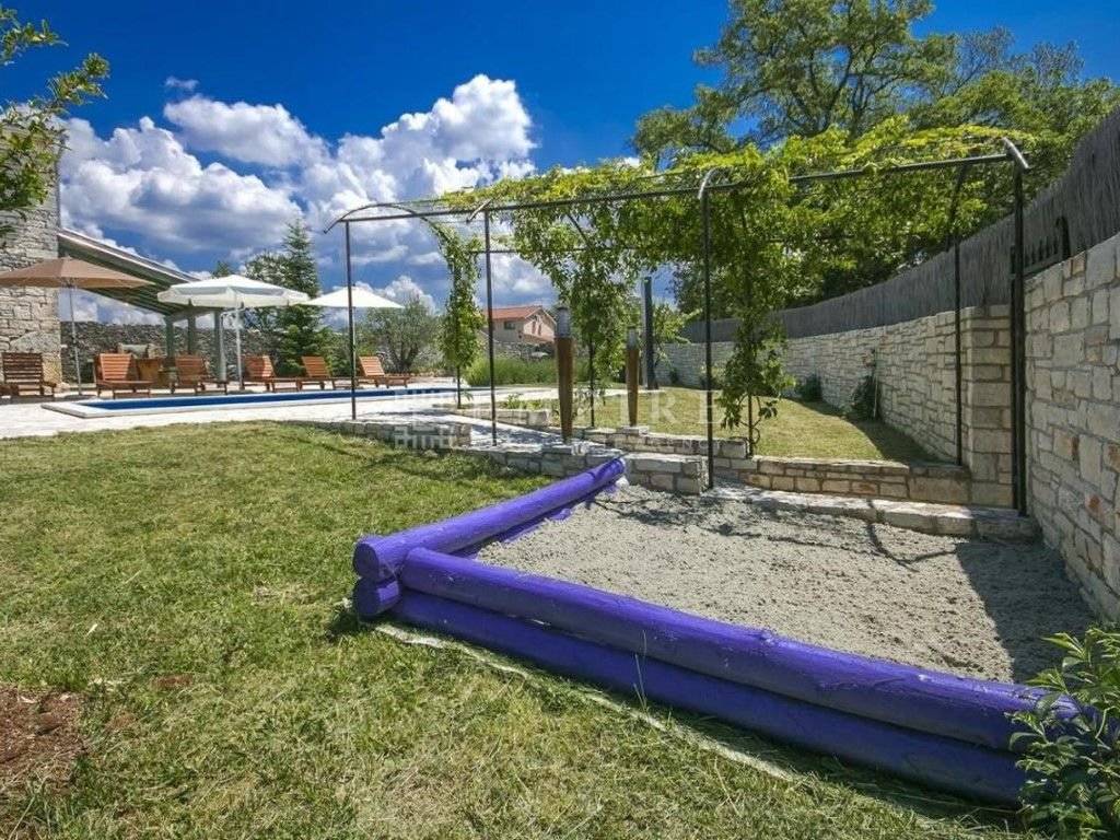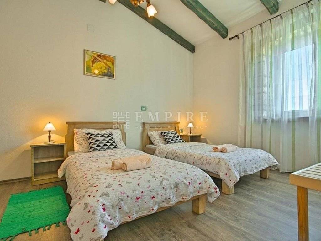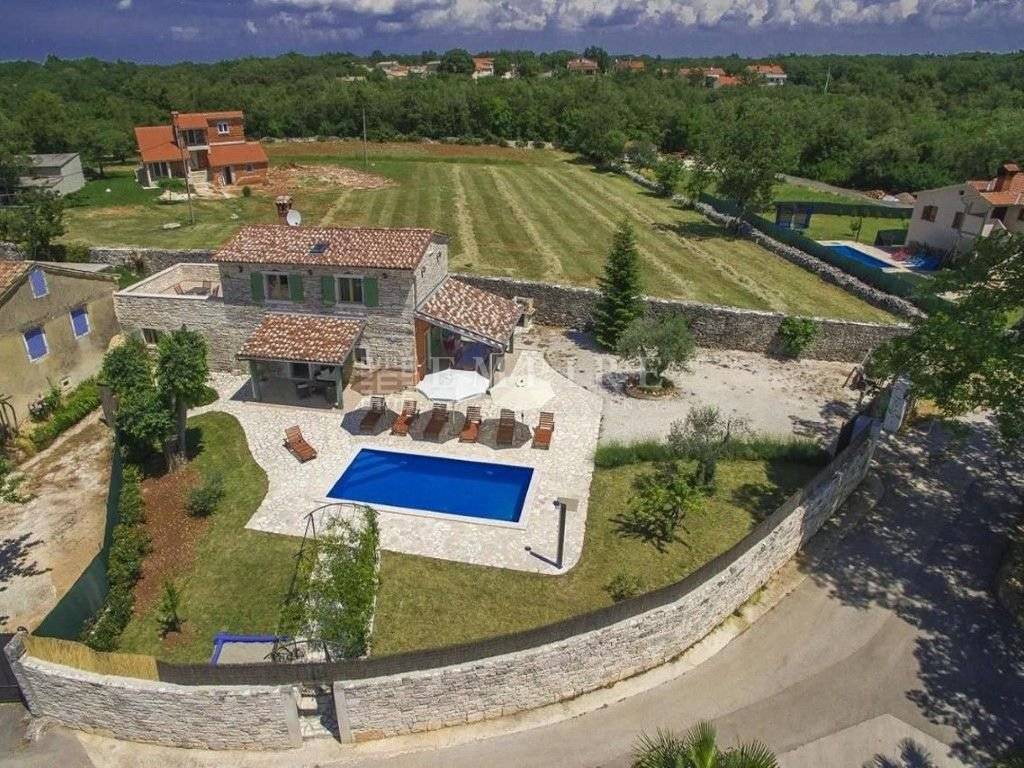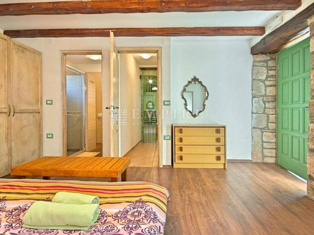 In central Istria, a renovated traditional Istrian house is for sale, along with an additional complex that has been partially renovated. Together, they cover a total area of 1931 m² of land and 345 m² of living space. The stone house with a pool consists of ground and first floors and is located within a fully enclosed yard with several parking spaces. On the ground floor, there is a bedroom with its own bathroom and access to the terrace, a WC, kitchen, dining room, and living room with a fireplace, which leads to a covered terrace with an outdoor dining area. On the first floor, there are two more bedrooms, a shared bathroom, and access to a terrace. The heating/cooling system is controlled by air conditioning and a fireplace in the living room. Next to the renovated stone house with a pool, there is another house that needs partial renovation. It consists of two bedrooms, a bathroom, living room, and kitchen. There are also two cellars and garages. Peaceful location!