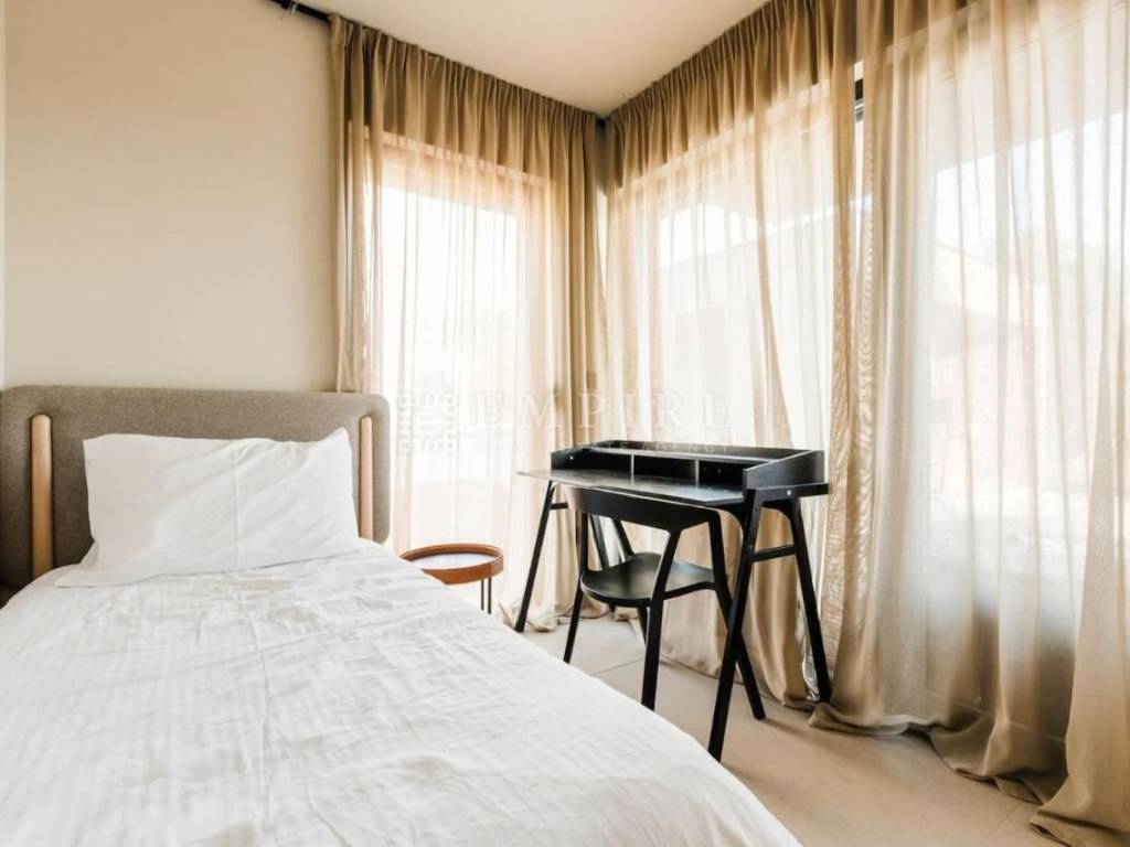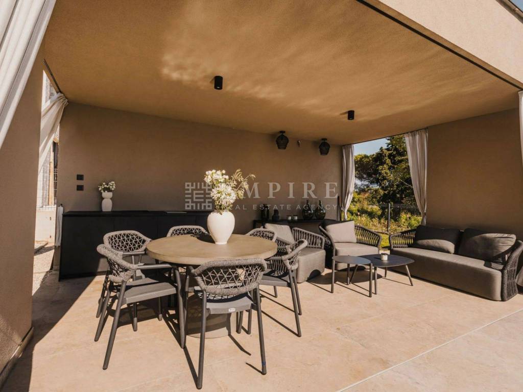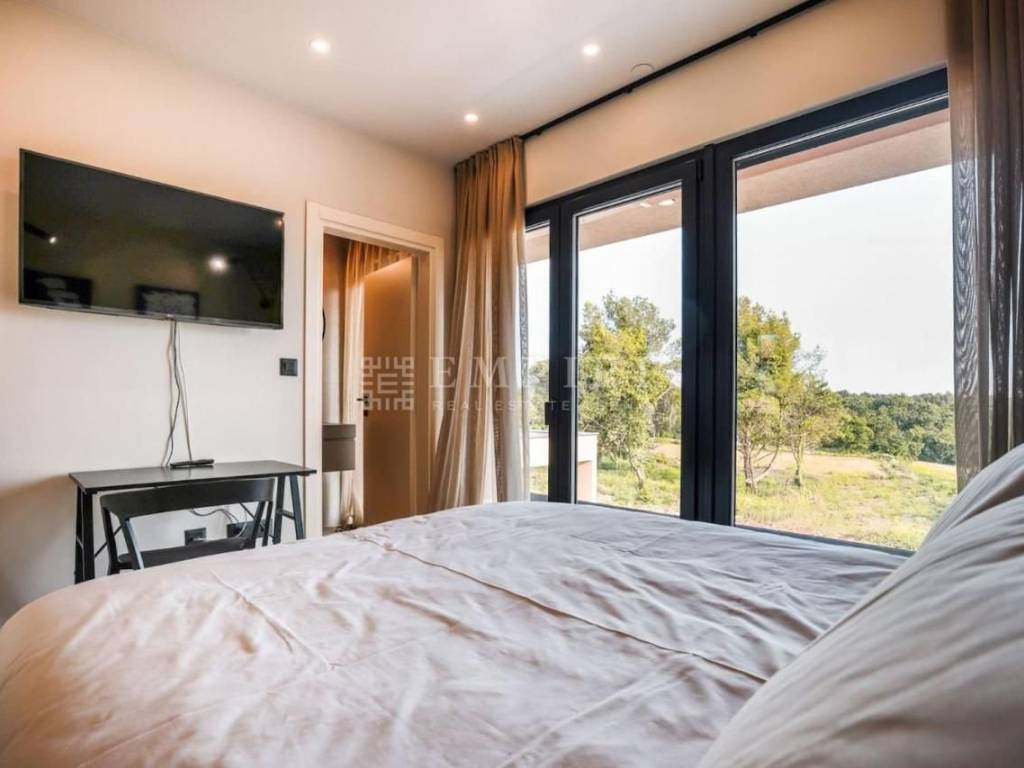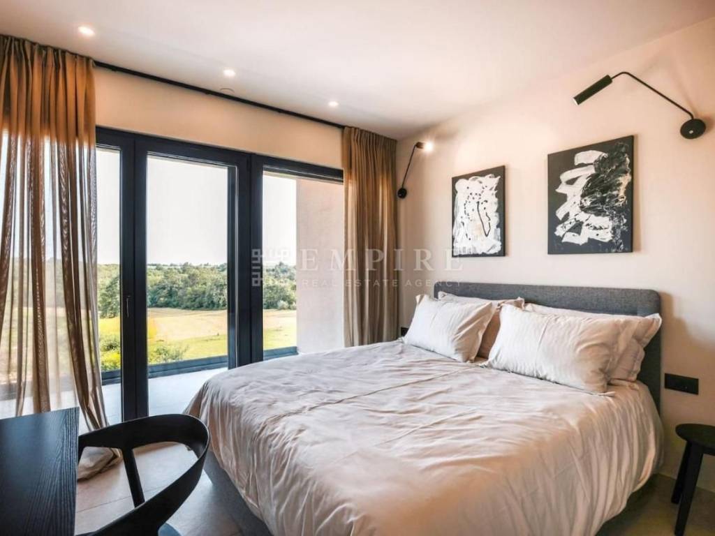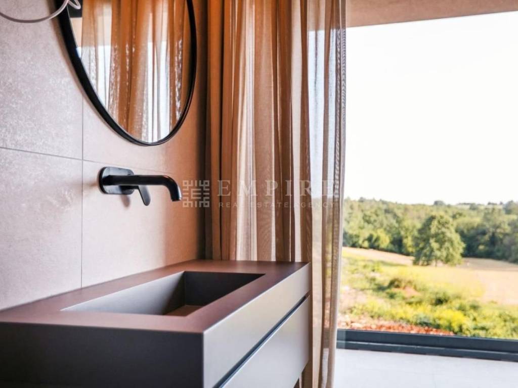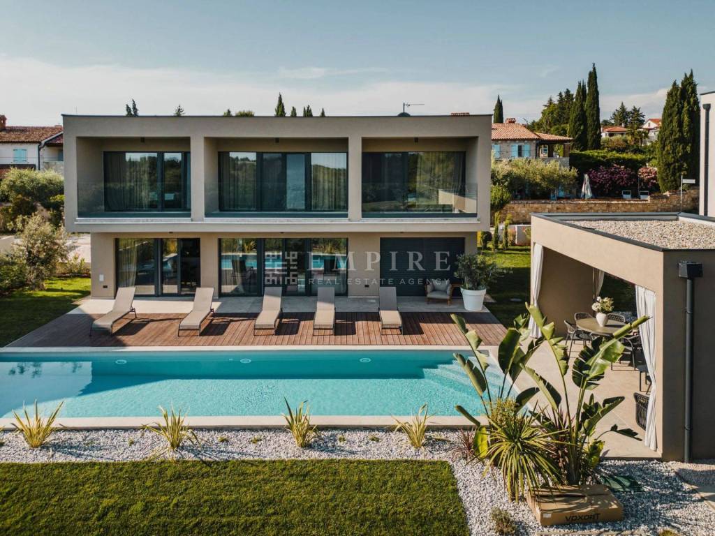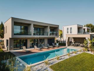 This elegant house, where luxury, comfort, and nature blend seamlessly, is for sale in a peaceful area near Poreč. The 160 m² house features an entrance hall, one bedroom, a bathroom, a toilet, a laundry room, a kitchen, and a living room. On the first floor, there are three bedrooms, each with an en-suite bathroom, and a terrace offering sea and nature views. The beautifully landscaped yard includes a pool, a jacuzzi, a summer kitchen, and an outdoor toilet. The house is equipped with underfloor heating, air conditioning, and an electric car charging station. A serene location surrounded by natural beauty!