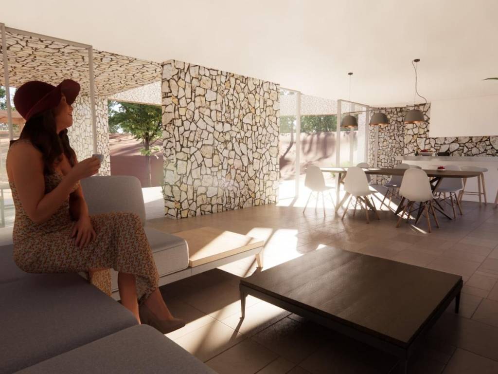 It extends over two floors, a basement and a ground floor, connected by an internal staircase. Upon entering the lower floor, you are greeted by an elegant open space living room with a dining room and a modernly equipped kitchen, ideal for socializing and relaxing. In the same area there is an exit to a covered and uncovered terrace, which leads to the pool and outdoor enjoyment area.