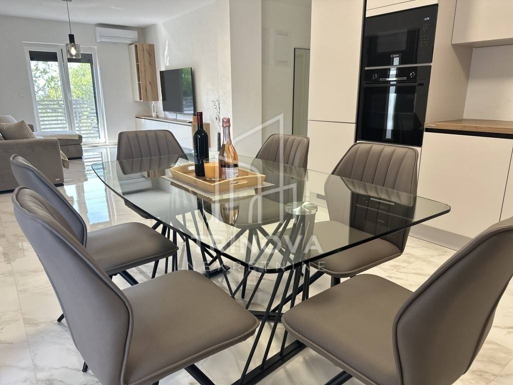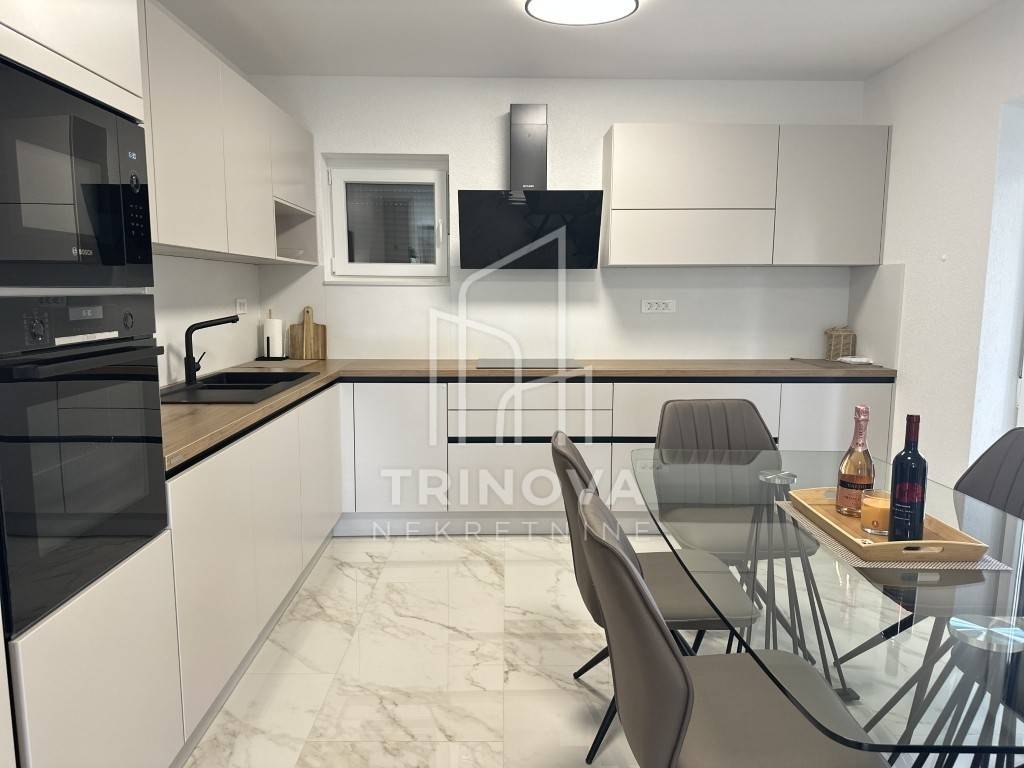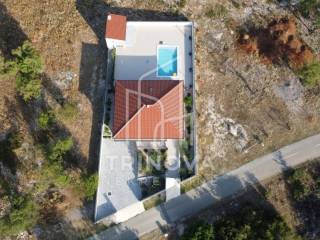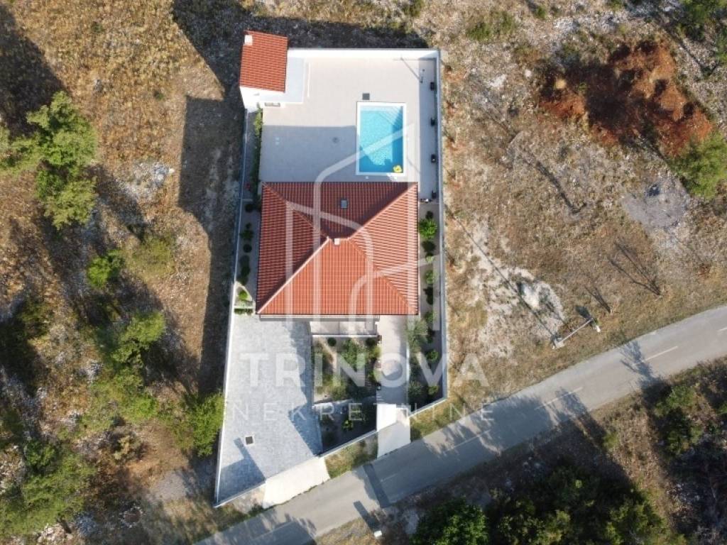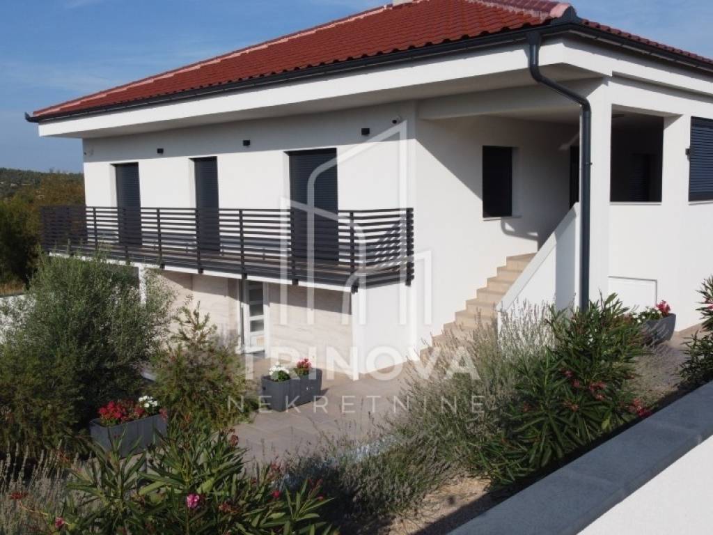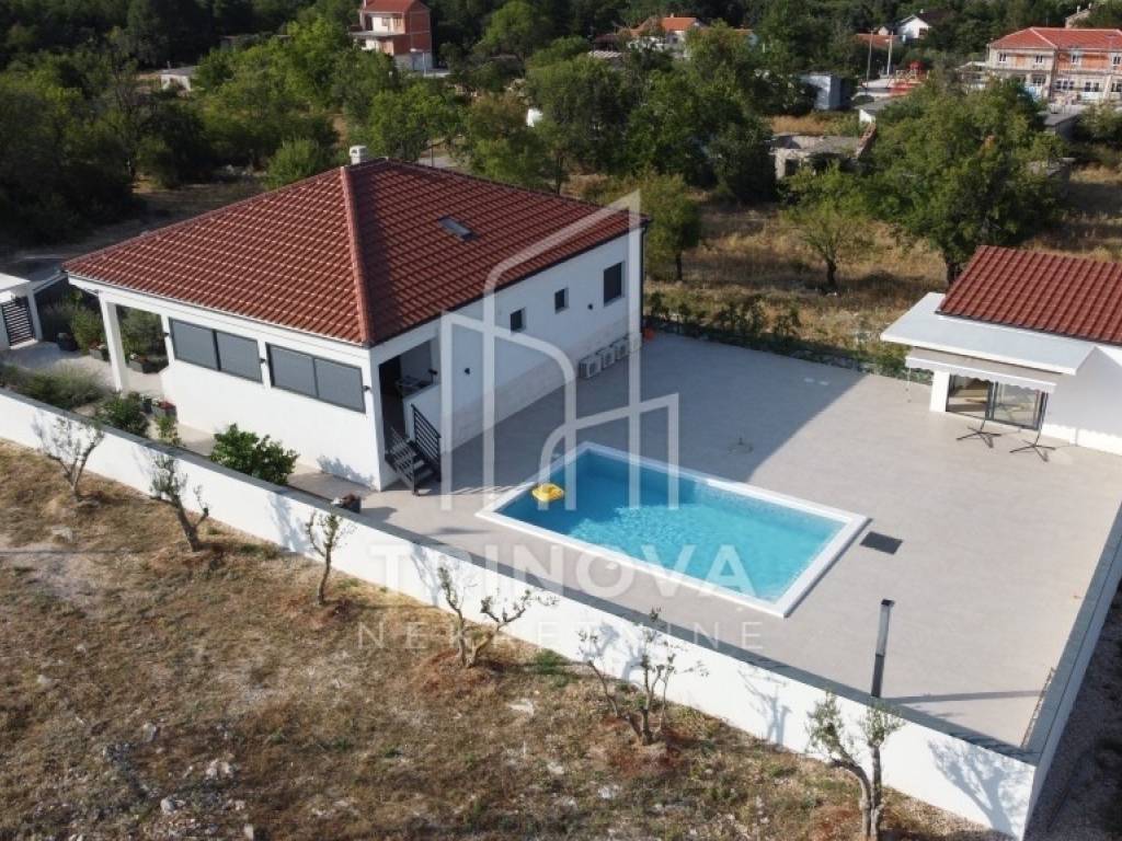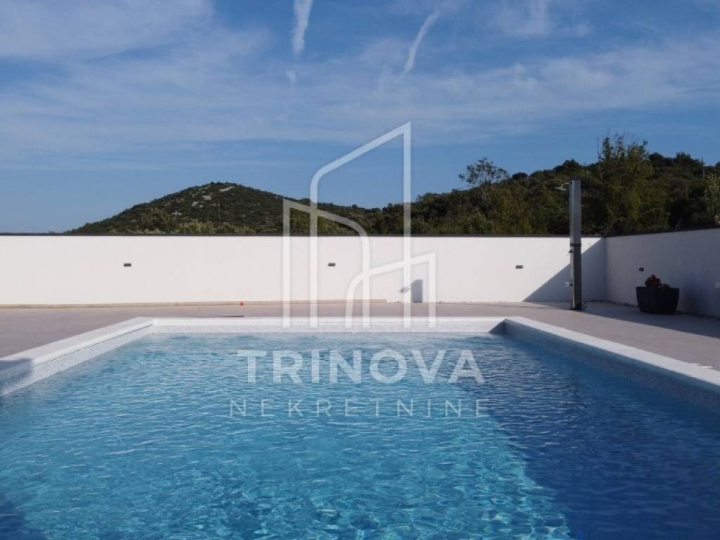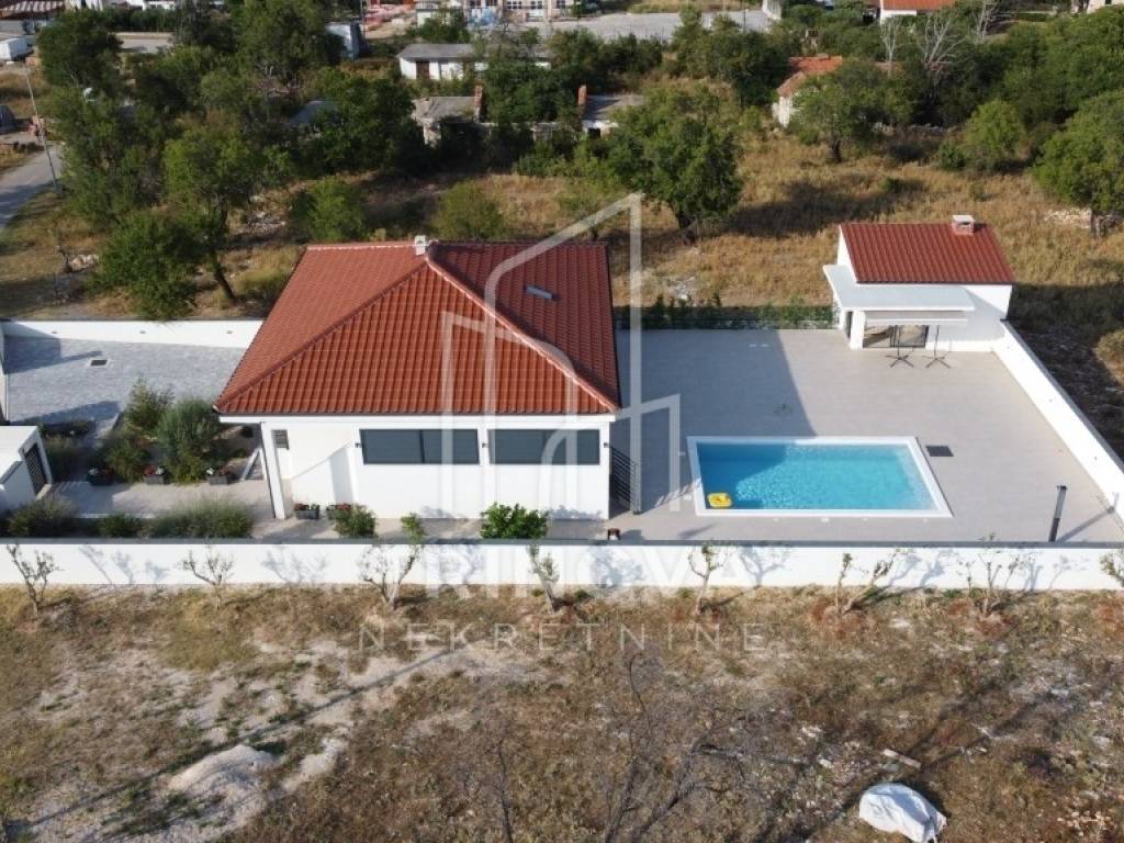 A fully furnished and equipped house with a swimming pool is for sale in a quiet village surrounded by nature, just 11 km from Biograd na Moru. The property offers 162 m² of living space and is situated on a beautifully landscaped plot of 792 m². The house is move-in ready and ideal both for year-round living or as a tourist rental.