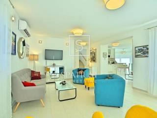 The first floor features three bedrooms, each with its own bathroom, two of which have access to a terrace. All rooms are air-conditioned, equipped with TVs, and filled with natural light thanks to large glass walls. The landscaped and fenced garden includes a swimming pool measuring 8x4 m, a sun deck, an outdoor shower, and an automatic irrigation system. The house is sold fully furnished with high-quality Italian furniture and has four parking spaces, two of which are covered.
