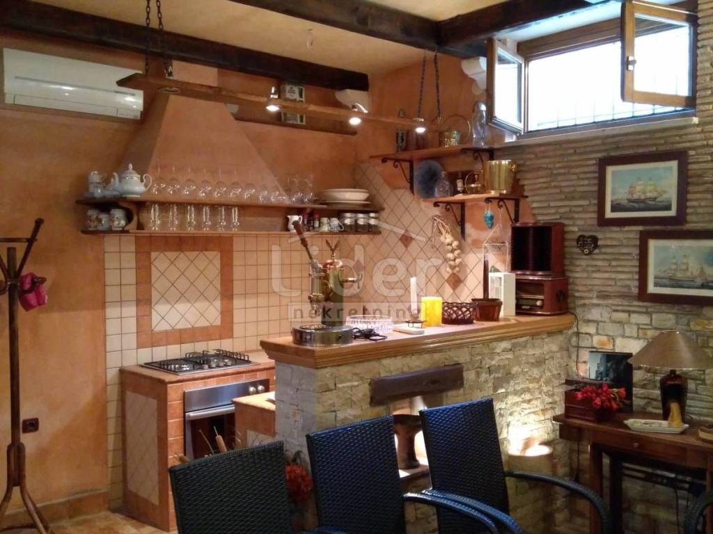 Upstairs is a living room with kitchen and dining area, spacious bedroom, bathroom with shower and storage. Everything is tastefully furnished, the sofa in the living room extends into a double bed. The beautifully decorated stairs lead to the lower part, which consists of a large cellar, bathroom with shower, kitchen, and storage. The pictures best show what kind of space it is. Walls lined with Istrian tiles, lots of old built-in stone erts, and a large open fireplace. The space is dominated by a large table made for friendly gatherings. The ceiling in the tavern is extremely high and space exudes the luxury of a good connoisseur of culture and comfort.