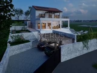 The yard is designed to provide privacy and peace, and a swimming pool and parking spaces for several vehicles are provided. As part of the construction, preparations will be made for solar panels and an electric charger for the car, which further emphasizes the modern and sustainable concept of the house.