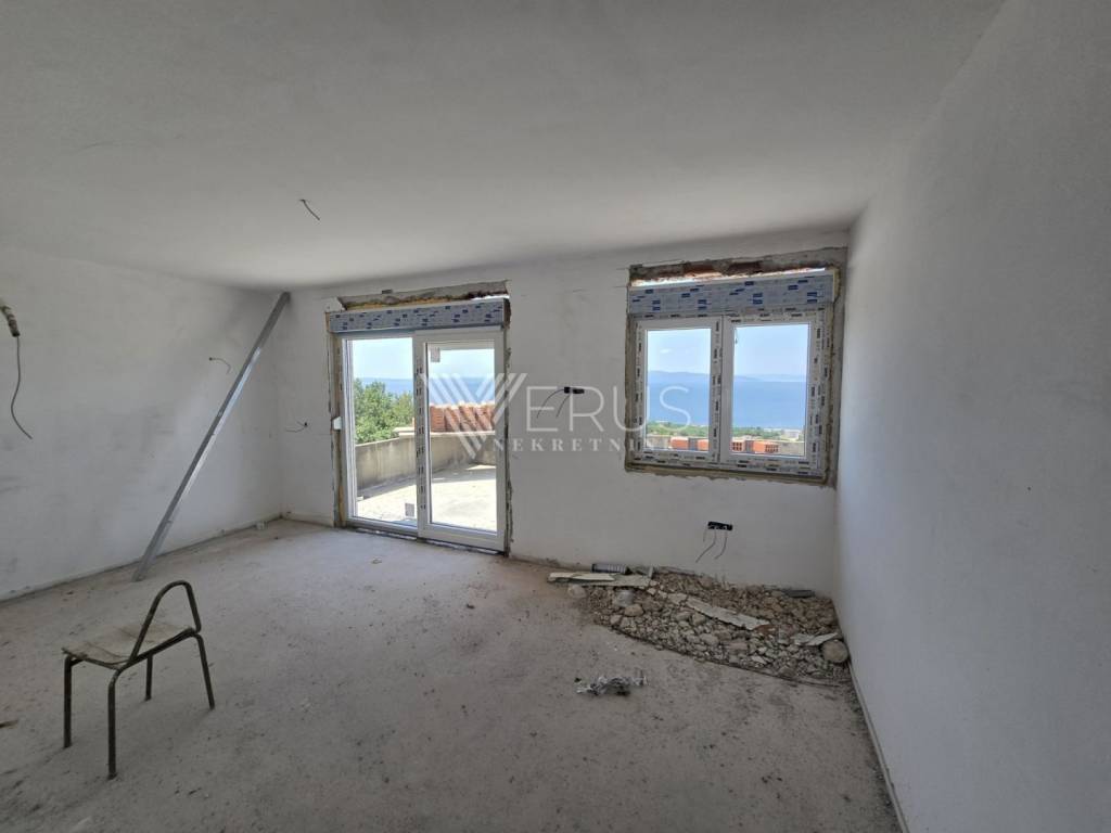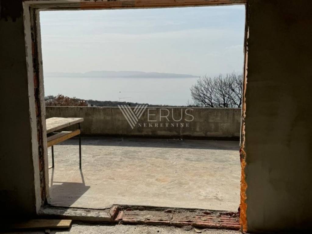 On the ground floor there is an entrance hall, a spacious living room with a kitchen and dining room in the open space concept, a bathroom with a toilet, and a practical space for laundry (utility). From the living area, you can access a large terrace with an open view of the sea.