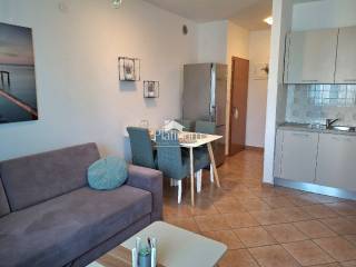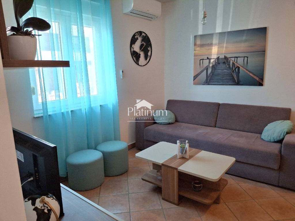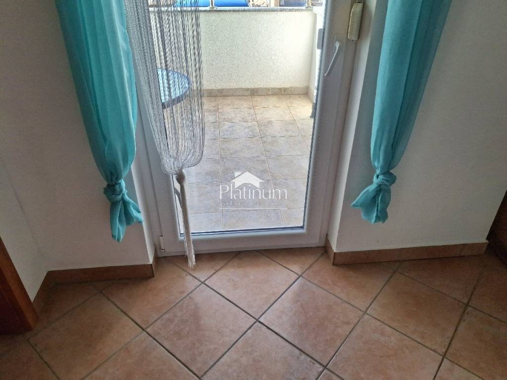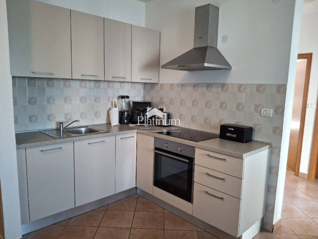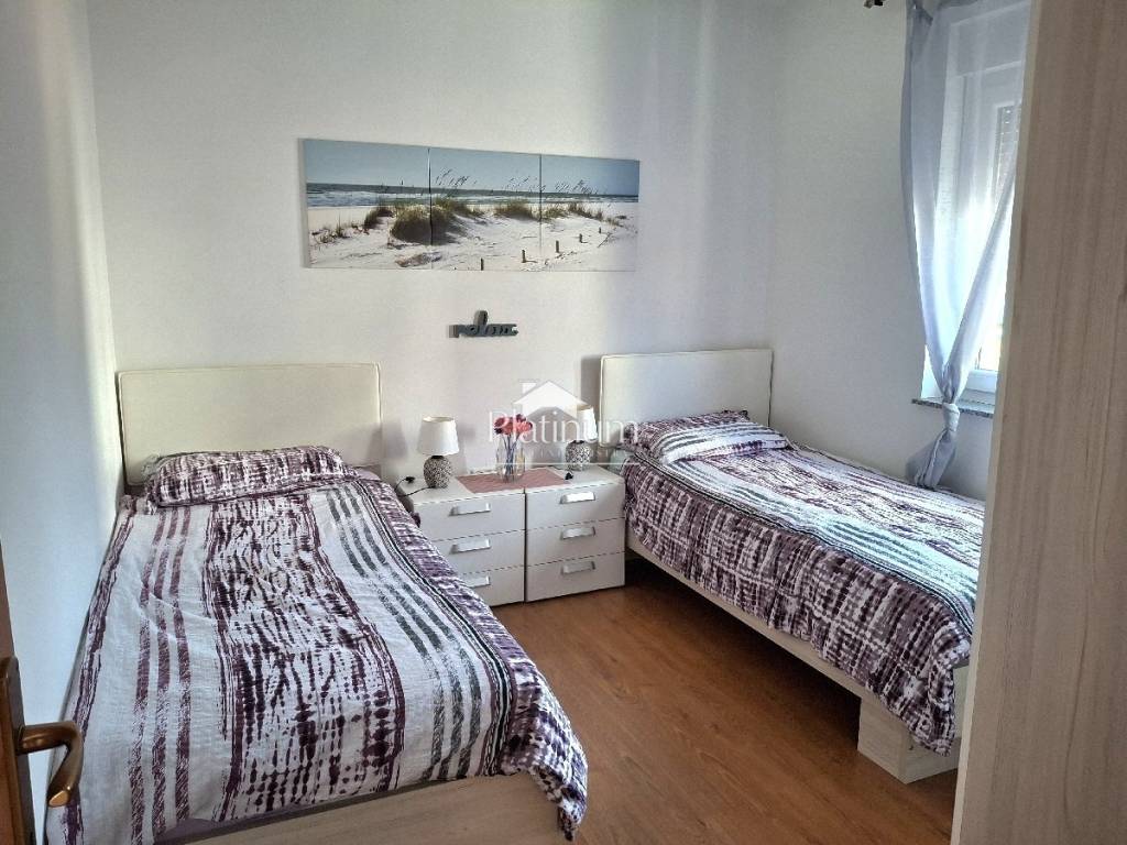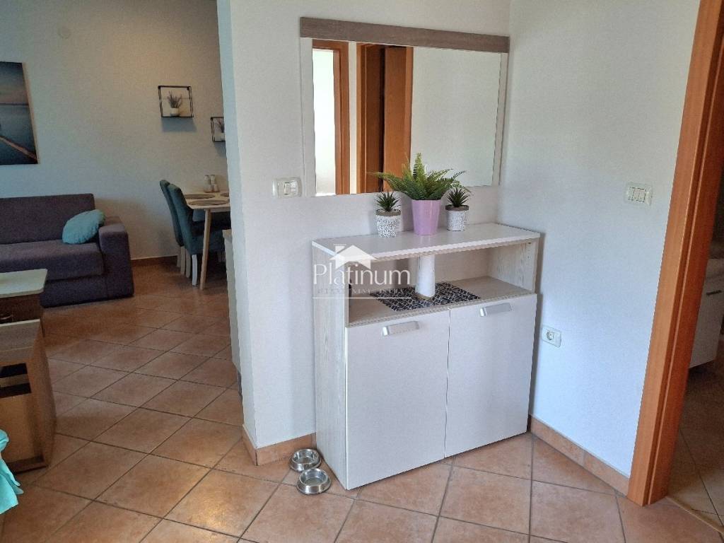 Prodaje se kompletno namješten i uređen stan u prizemlju, ukupne površine 60,60 m2. Stan se sastoji od predprostora, dnevnog boravka s kuhinjom i blagovaonom, dvije spavaće sobe, predsoblja, kupaone i loggie. Pripada mu parking mjesto ispred zgrade. Nalazi se na lijepoj i mirnoj lokaciji, udaljenoj 950 m od mora i plaže.