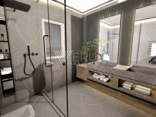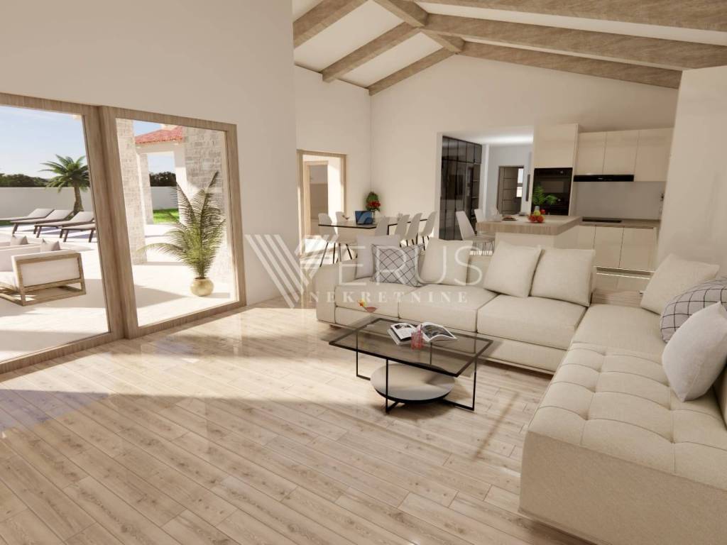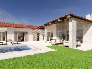 We are selling a detached one-story house under construction. The house is located at the end of a small town surrounded by greenery and olive groves. It consists of three bedrooms, of which the master has a private bathroom with a toilet; an open-space concept of a living room with a kitchen; a hallway; a utility room; another bathroom with a toilet; and covered terraces. There are parking spaces, a swimming pool, and a cultivated garden on the spacious garden. The pool measures 8x4 (32 m²). Cooling in the house is intended for air conditioners. The house will be equipped with first-class materials. There is a possibility that since it is under construction, the future customer will adjust the floor plan and layout according to his taste. The first stage of floor heating will also be installed, so the customer can choose heating in the house. The house is sold in the turnkey phase, and the buyer is exempt from real estate sales tax. Under the house is an olive grove and a green belt, and there is no further construction. Excellent property in a quiet location, just a few minutes' drive from the town of Labin. AGENT RECOMMENDATION!!!