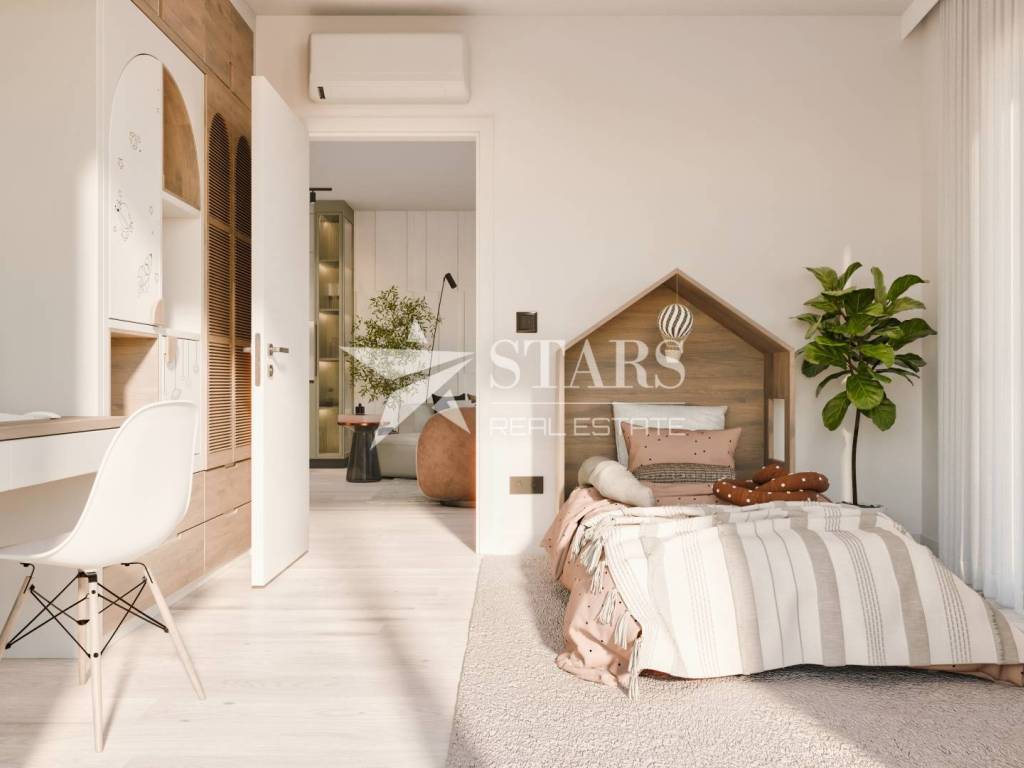 A generous living and dining area opens to the terrace, while the separate kitchen, three bedrooms and two bathrooms provide comfort for larger households. Premium finishes include oak parquet floors, large-format ceramic tiles, Bosch multisplit air conditioning, electric shutters, and security doors.