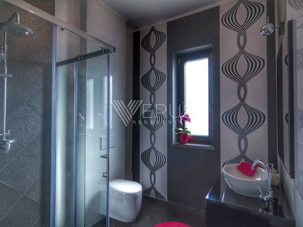 The exterior is equally impressive—the spacious and fenced garden is decorated with Mediterranean plants and palm trees, while the private pool with a panoramic view offers the perfect place to relax and enjoy peace. The covered terrace is ideal for socializing, and a large private parking lot is also available.