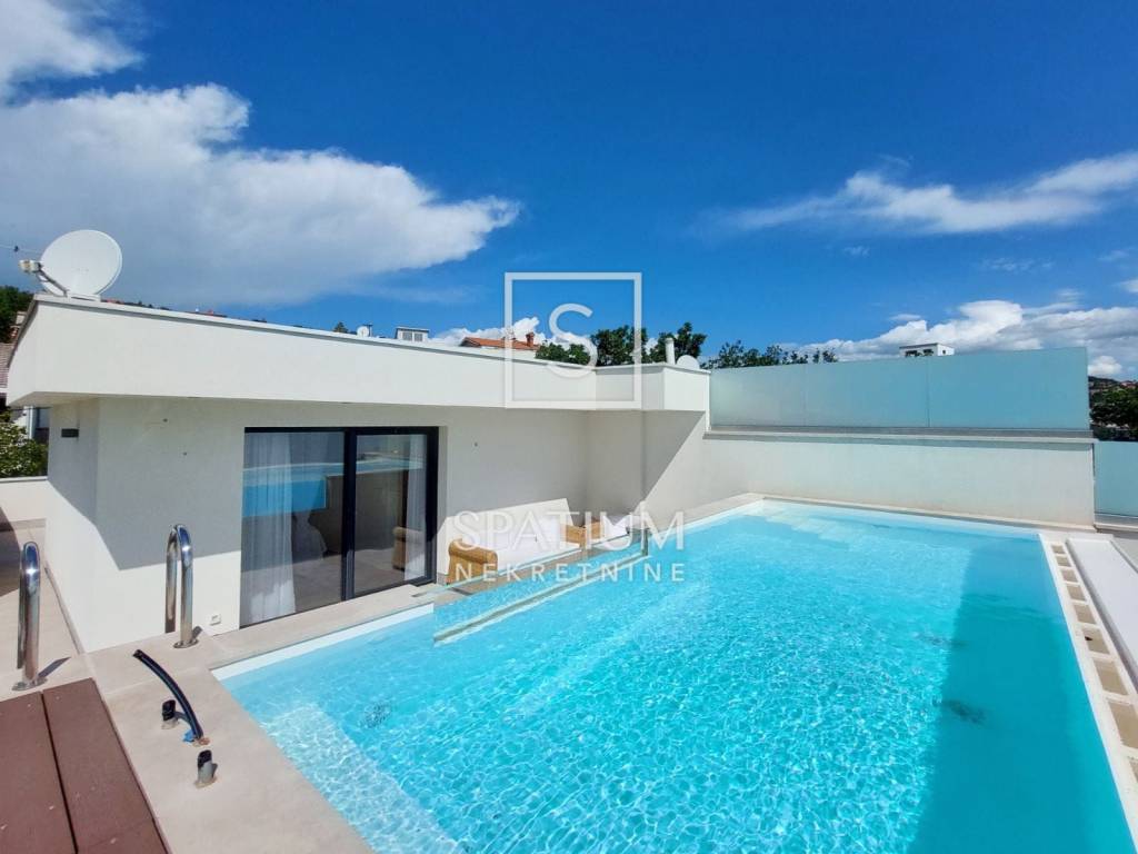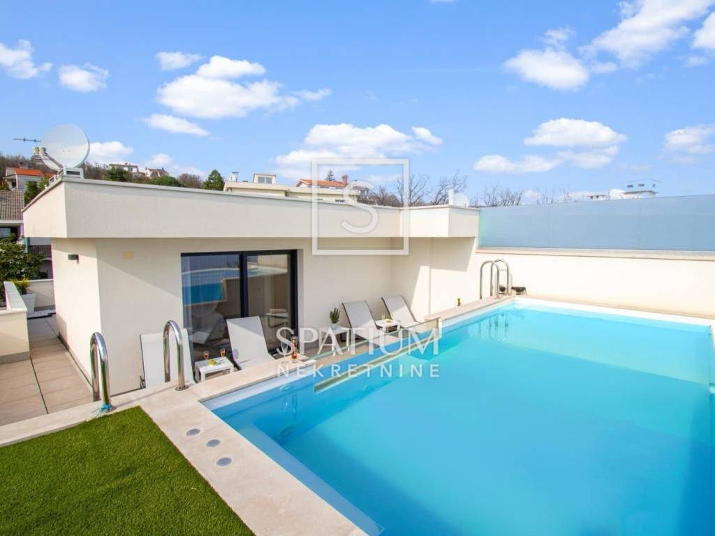 POBRI, OPATIJA, we are offering a luxurious penthouse with a view of Kvarner, with a total living area of 210.37 m2. It consists of three floors; basement, ground floor and first floor. In the basement there are two rooms with their own bathrooms, a storage room and an entrance hall. The ground floor consists of an entrance hall, an open living room with a kitchen and dining room, a pantry, a bedroom and a bathroom. The living room leads to a spacious balcony with a view of the sea. Upstairs there is another room with its own bathroom, an engine room, and a sunny terrace with a swimming pool. Also, the apartment has a basement where there is a tavern and storage room, as well as a parking space for several cars and a garden of 285 m2. Thanks to its orientation, the entire property is extremely bright and pleasant. Subject to high-quality construction and insulation, utilities are low, and the furniture and household appliances, which are included in the price of the property, are of the same quality. Opatija, a beautiful seaside town on the Adriatic Sea and a famous 19th-century health resort, is a popular destination for tourists from all over the world. The city is surrounded by unique natural beauties. It is located below the Učka mountain, which is a favorite destination for mountaineers and hikers. It is at the transition between the green Istrian region and the coast, and forms a perfect balance of the landscape. The town offers a beautiful view of the sea and the nearby islands of Krk and Cres. It is surrounded by charming historic towns with narrow streets and a rich history. Opatija is adorned with a large number of unusual sights, a large number of beaches, clear sea, and its city streets are dotted with houses of interesting architecture and villas from the Habsburg era. For all other information, please contact us with confidence. Rok Lulić mediation assistant + 385 91 2206 204 rok@spatium.hr Spatium nekretnine + 385 51 272 903 info@spatium.hr