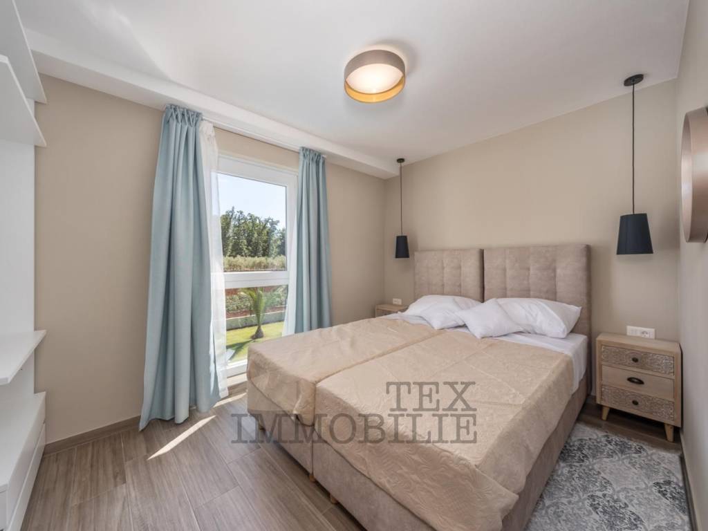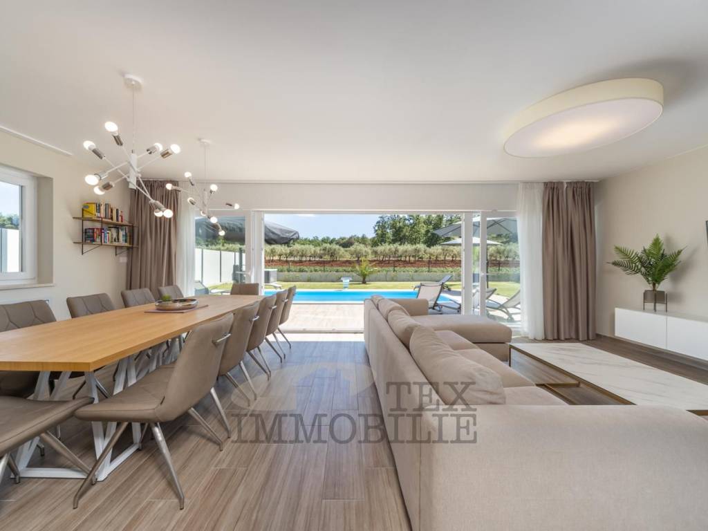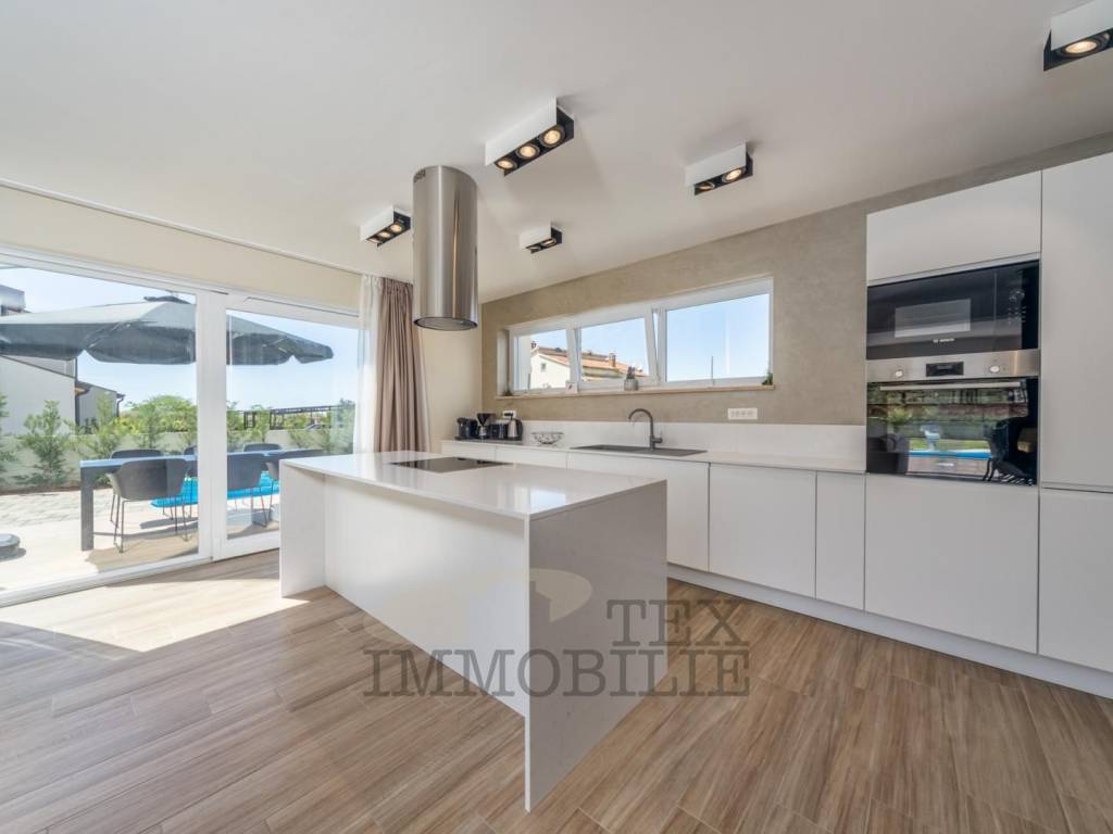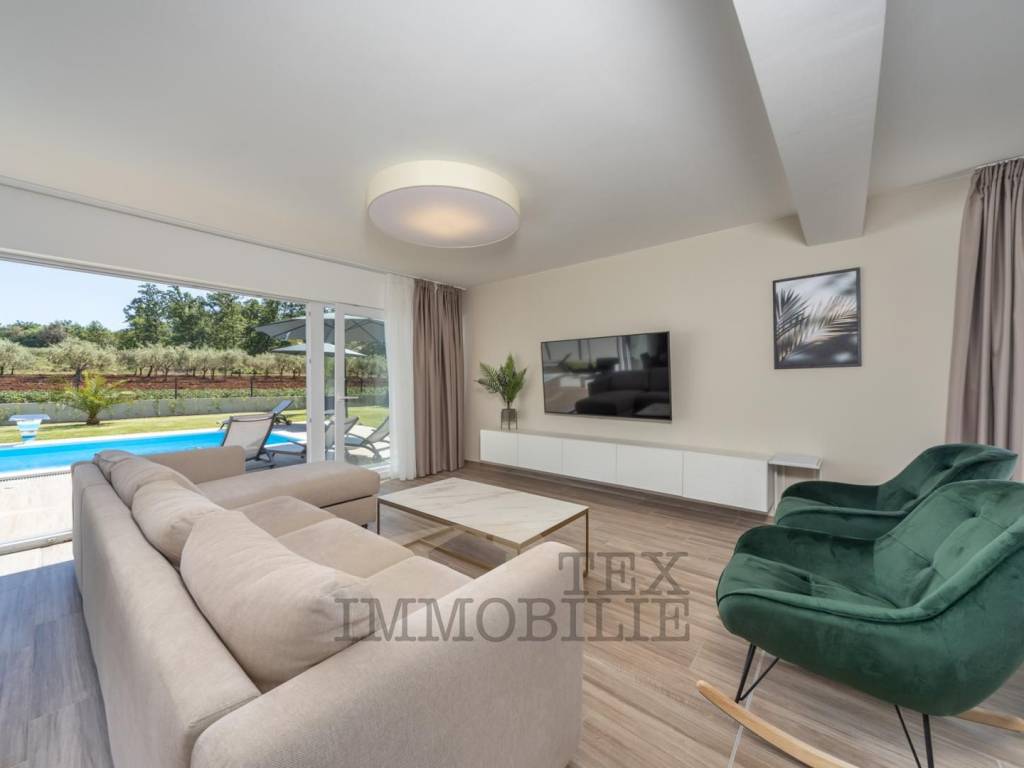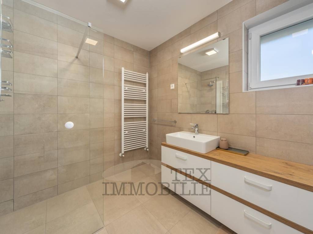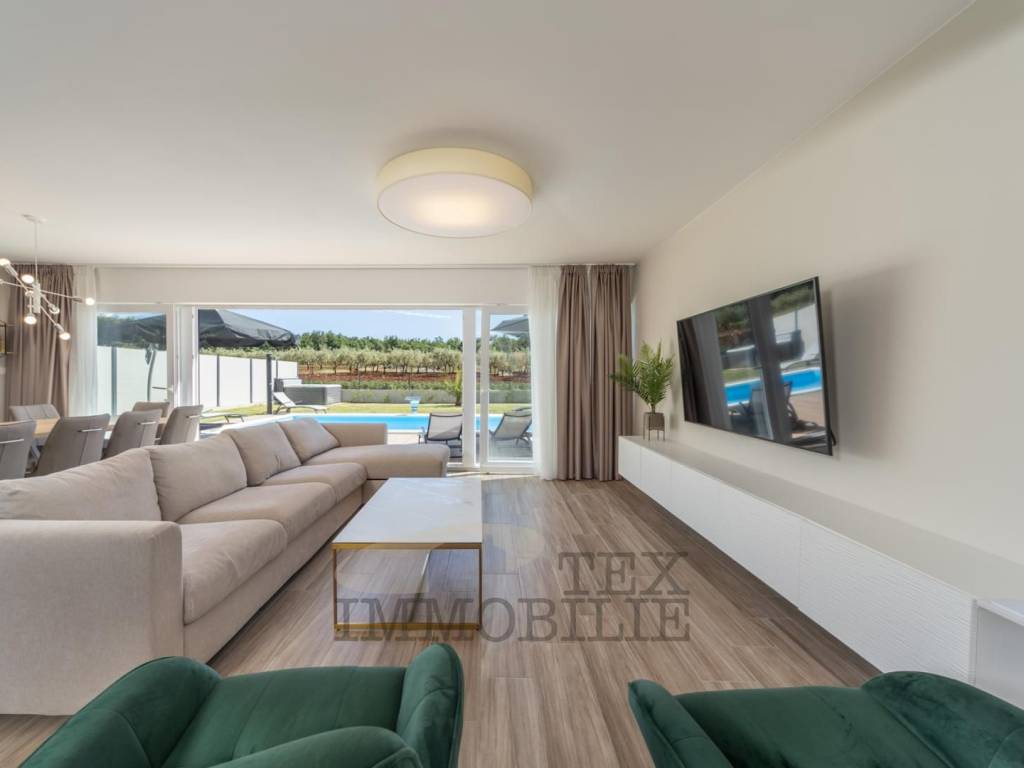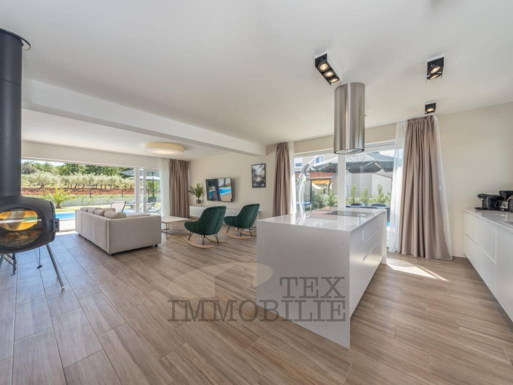 Villa with sea view for sale, only 5 km from the sea and the city center. The villa consists of 6 bedrooms, 4 bathrooms, one guest toilet, kitchen, dining room, living room with fireplace, boiler room, storage. Heating: floor - heat pump and fencoilers Heating - cooling. Automatic irrigation of the environment, Heated Pool + sauna + jacuzzi. The house is completely furnished with new furniture and as such is for sale.
