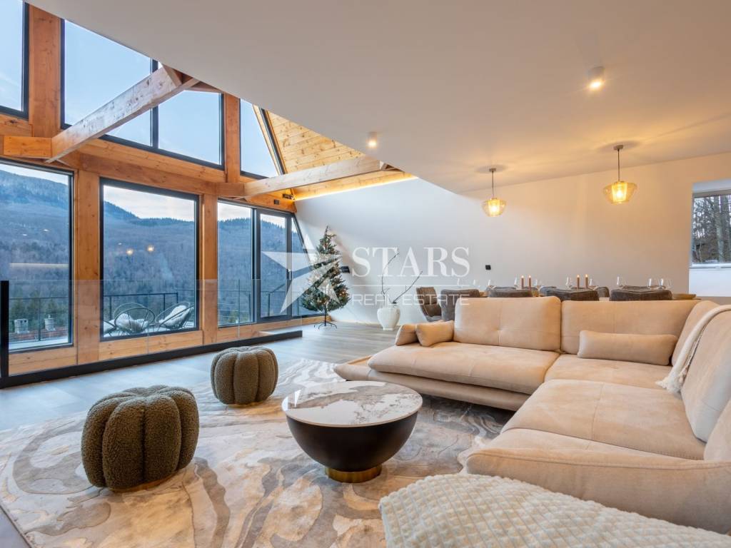 The upper floors house three additional bedrooms with bathrooms and a particularly impressive attic space featuring panoramic windows. Here, nature isn't just a view—it's a way of life.