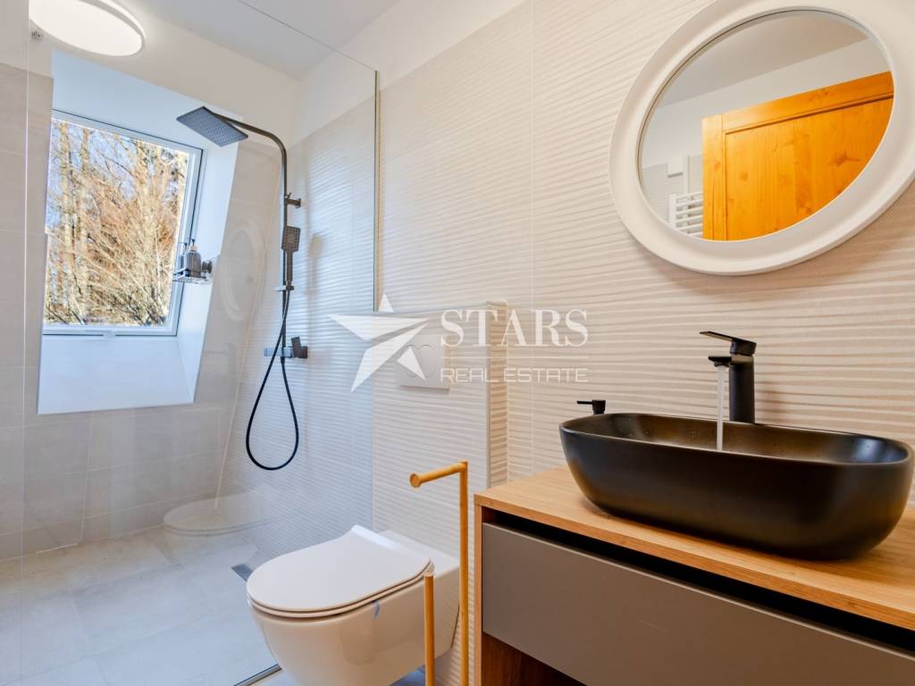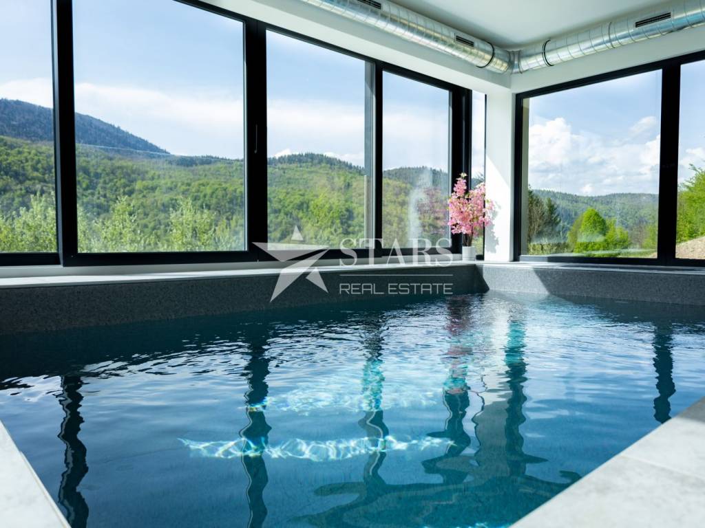The basement features an elegant wellness area and an indoor pool, fully equipped for year-round use with advanced systems including air recuperation, dehumidification, heat exchange, and heat pumps. Each room is equipped with individual temperature regulators, controllable via mobile devices.